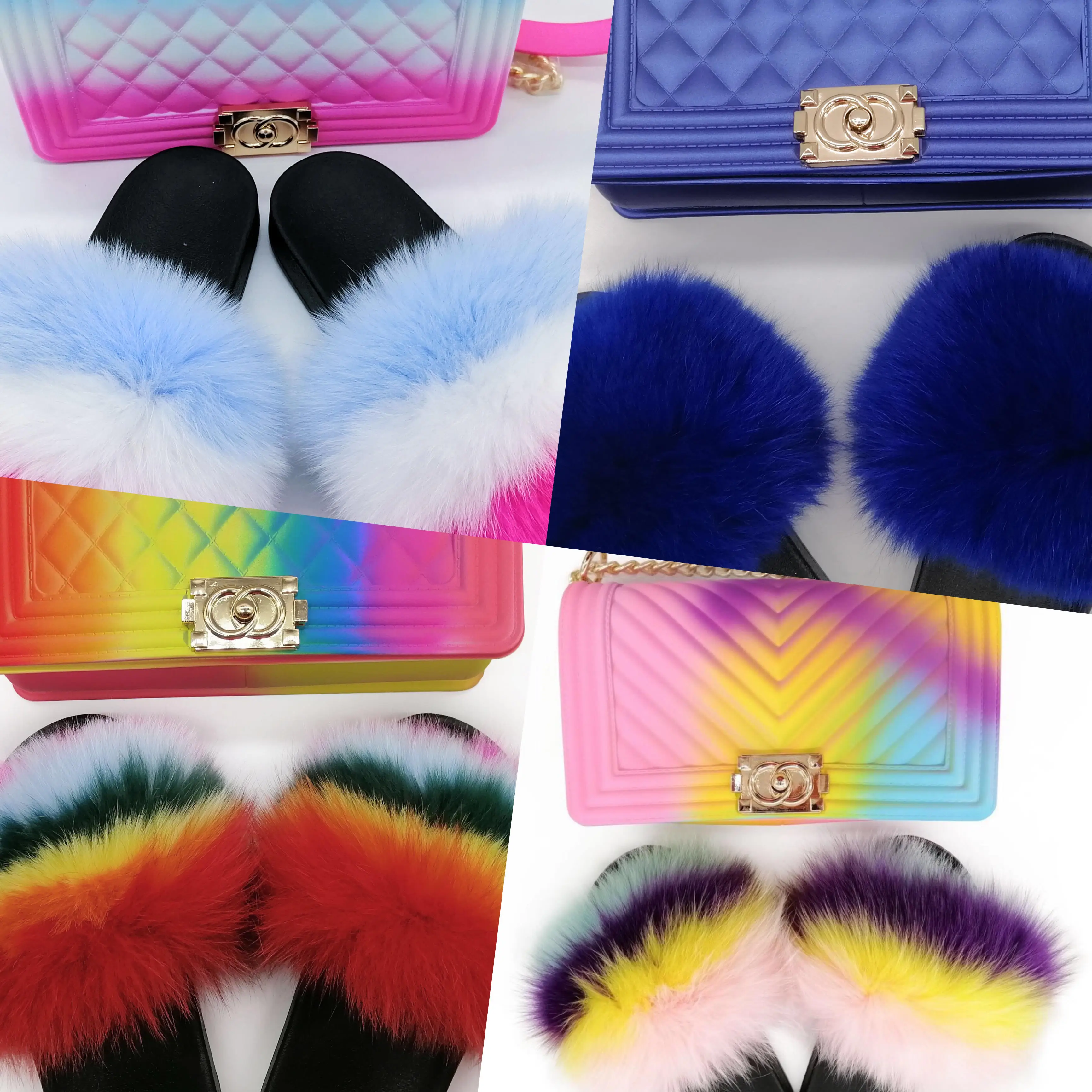 2020 PVC Sole Multi Colors Rainbow flag color Fox Fur Slippers Natural Color Raccoon Fur Slides with Purse for Girls
