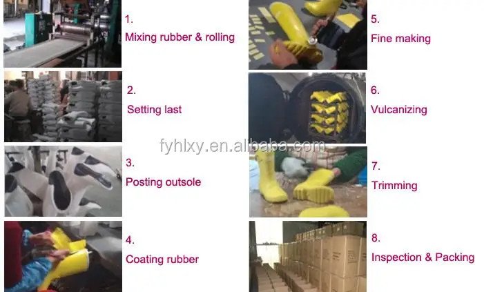 Rubber boots are handmade products with over 200 years history.Due to the manufacture process of rubber boots is very complicated, the production line needs over 100 workers to cooperate, including mixing rubber, rolling, cuting, setting last, pumping, posted outsole, valcanization, trimming, inspection, packing, etc.