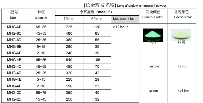 2.Photoluminescent powders in general grain sizes usually have better luminescence. However, it is recommended to select the photoluminescent pigment of proper granularity in accordance with your specific manufacturing process.