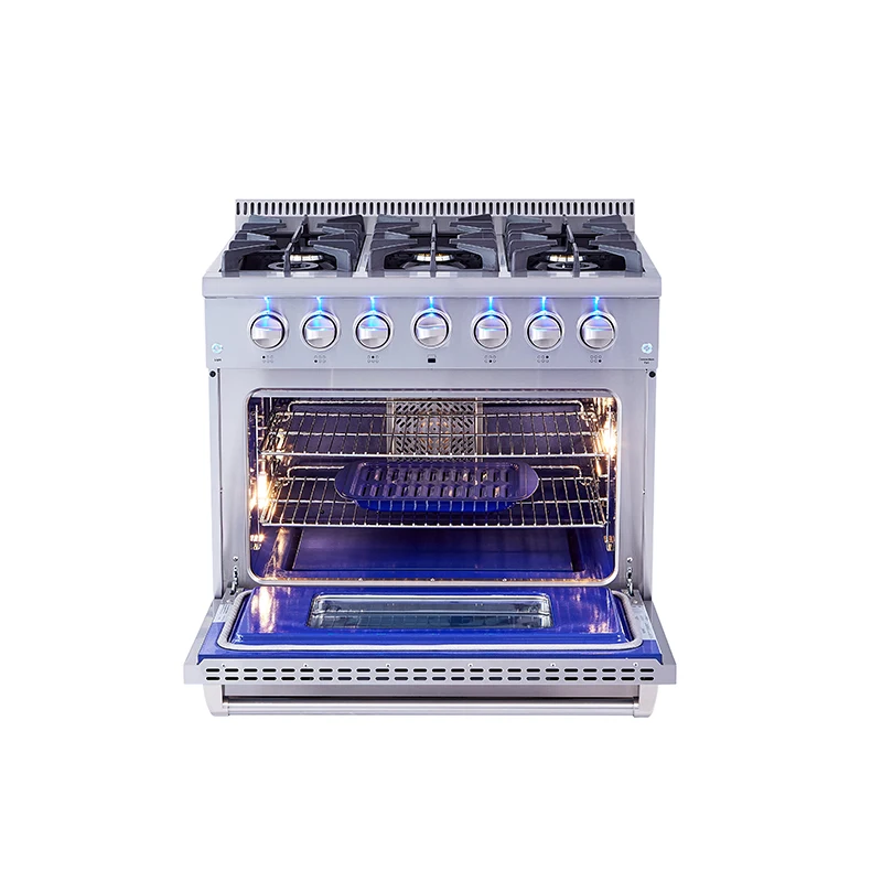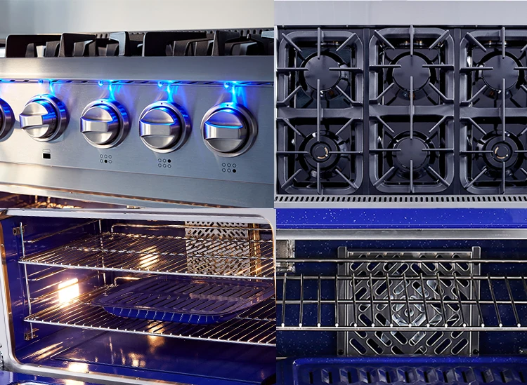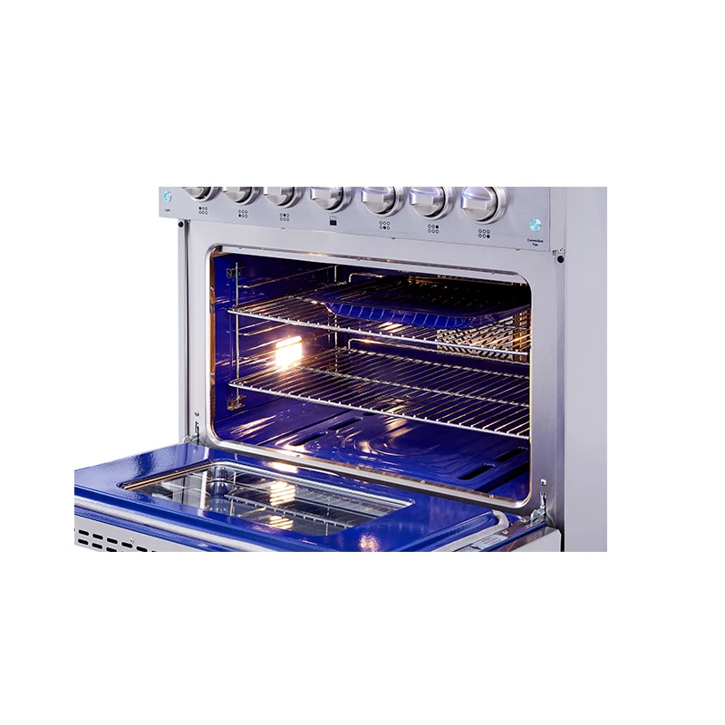 •5.2 cu.ft oven capacity •Infrared broil burner: High-end broiler radiates the heat to sear your food and seal iin the juices:1 x 16500BTU; U shape stove burner: 1 x 22000BTU •Blue porcelain oven interior •Commercial convection fan circulates heat for even distribution •2 x Halogen Lights increase visibility for the oven interior •Thermostatically Controlled to attain the right temperature •Two nickel platted oven racks