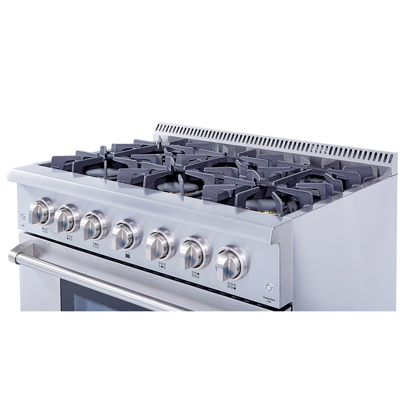Cooktop: •2 x Sealed Dual Burner x 15000BTU with 650BTU simmer function 1 x Sealed Single Burner x 18000BTU 3 x Sealed Single Burner x 12000BTU •Automatic re-ignition if the burner flame extinguishes •Black Porcelain Drip Pan to facilitate surface cleaning •3 x Continuous cast-iron cooking grates Control panel: •304SS Control panel •7 x high quality control knobs