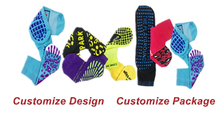 Custom trampoline park socks are a great marketing tool that can be used to promote your business. Our design team will work with you to establish an exclusive design that is attractive for young jumpers. Many jumpers like to collect these socks and wear them to show to friends.