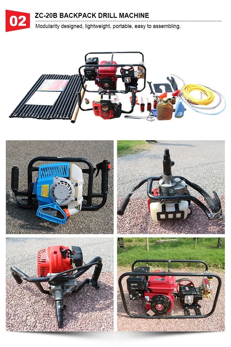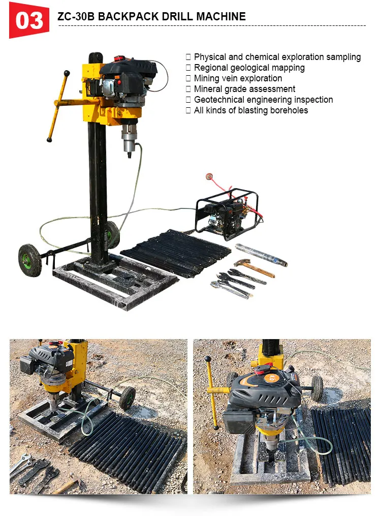 ZC-30B | Adapt to geology: soil layer, loose cover layer, various rock layers Water consumption: about 0.3L / min Drill rod length: 750mm (including joints) Drill rod material: 40r Weight of drill pipe: 3KG Rated speed: 1900 | |||||||