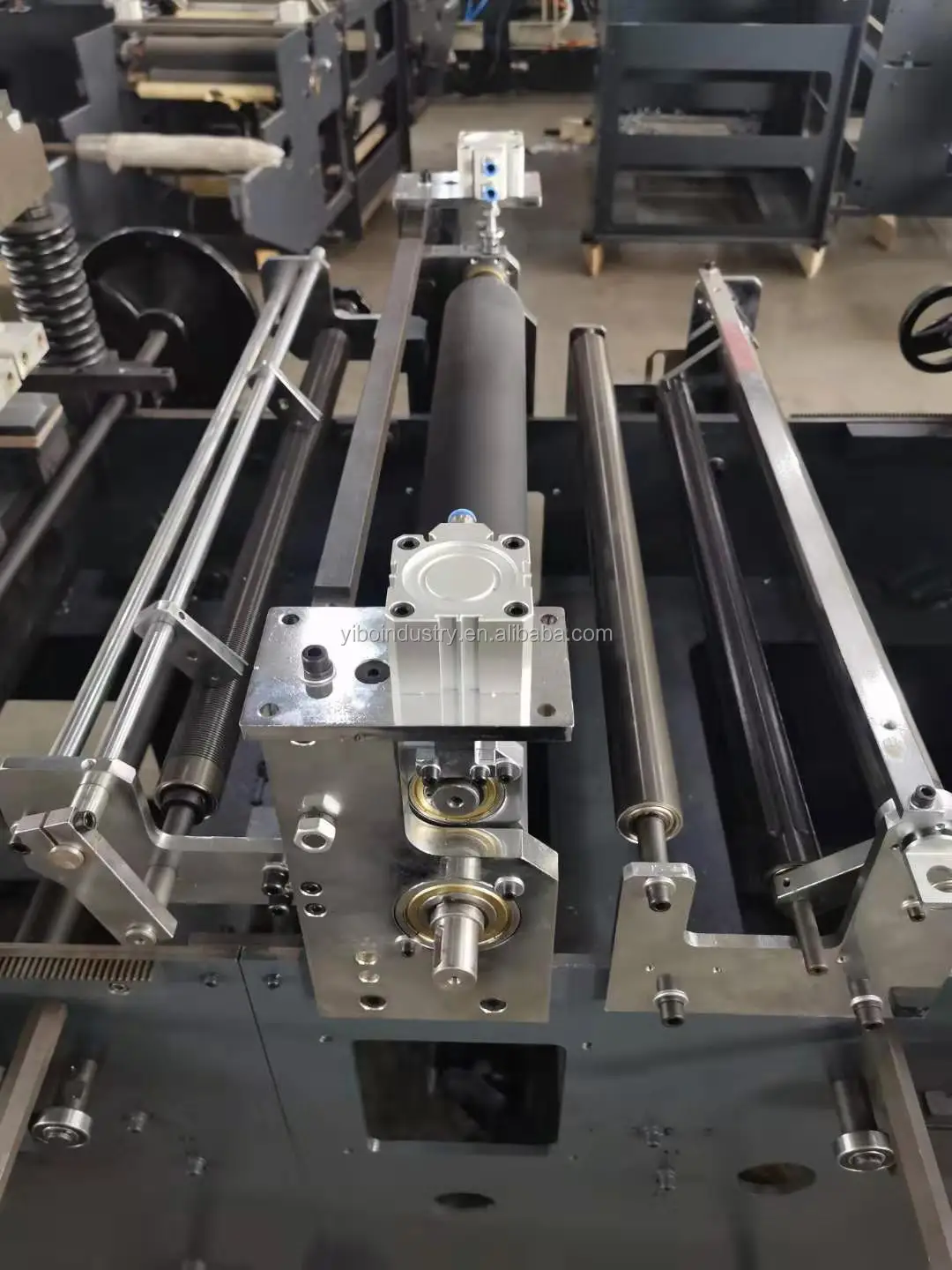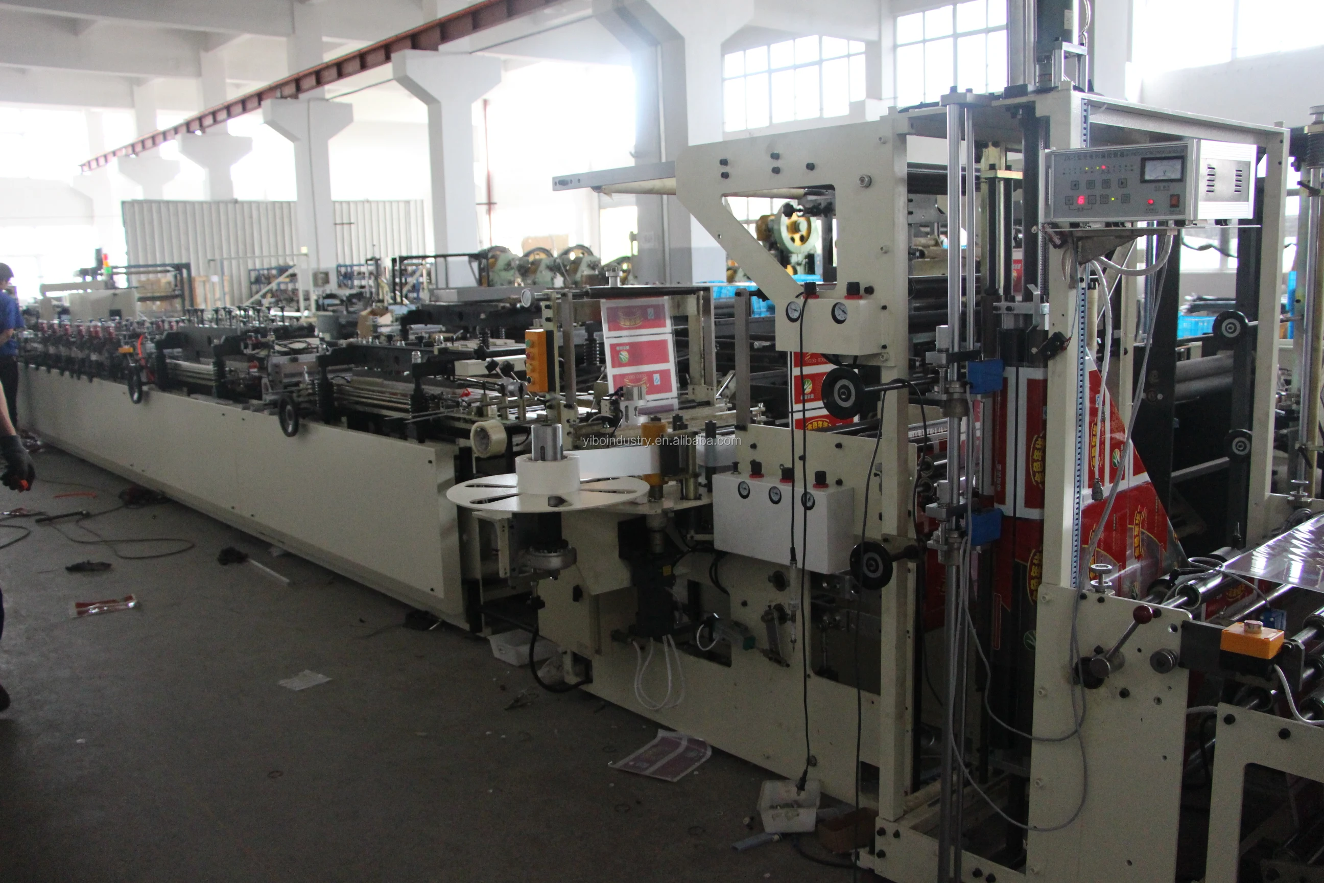 Feature This machine processing and assembly is superior, shape is beautiful and structure is reasonable. The whole machine can run smoothly with low noise. Bag hole can be punched accurately. The speed is fast. The machine adopts PLC two servo traction control, temperature centralized control, reducing electricity consume. The feeding system adopts constant tension control, and ensures the smoothness of the material and the accuracy of the control. Middle tension floating roller adopts dynamic compensation mode, to make the process of pulling material fluctuates slightly. Tension control is stably. 1. Technical Parameter: Function: Three side bag,Middle-side (gusset) sealing Bag Main Electric Device: Two Servo Motor, Panasonic PLC, AC motor masterdrive, Panasonic frequency converter, Temperature control 14 Road, Tension control unwinding. Base material: two-layer or multi-layer three-side sealing laminated film pouches with zipper sealing and doy-pack making function which take BOPP, PET, CPP, PE, nylon, aluminum foil and paper as base material. Max working speed: 150 times/min (For gusset bag about 120 times/min) Max unwinding line speed: ≤38 meter/min (subject to base material) Making bag size: length (400mm), It adopts times to send when the length is more than 400mm. (Max times to send is six) Max width of bag: 500mm Max size of roll material: φ600×1050mm(Diameter×Width) Location precise: ≤±0.5mm Heating sealing knife quantity: 4 set Longitudinal Knife, warming and cooling up and down. Transverse Knife: 3 set warming up and down. 2 set cooling up and down. Temperature electric heating quantity: 12 piece. Temperature range: 0~300℃ Total Power: 30Kw (Starting power is about 25kw, in condition of keeping warm, power is about 20kw) Overall dimension: 10500×1600×1950mm(L×W×H) Net weight: About 5500 kg. Machine steel plate thickness: 10mm (Made in Shanghai, Baosteel) Control system Model: Japan Panasonic PLC Laminating Film High speed bag making machine control system.