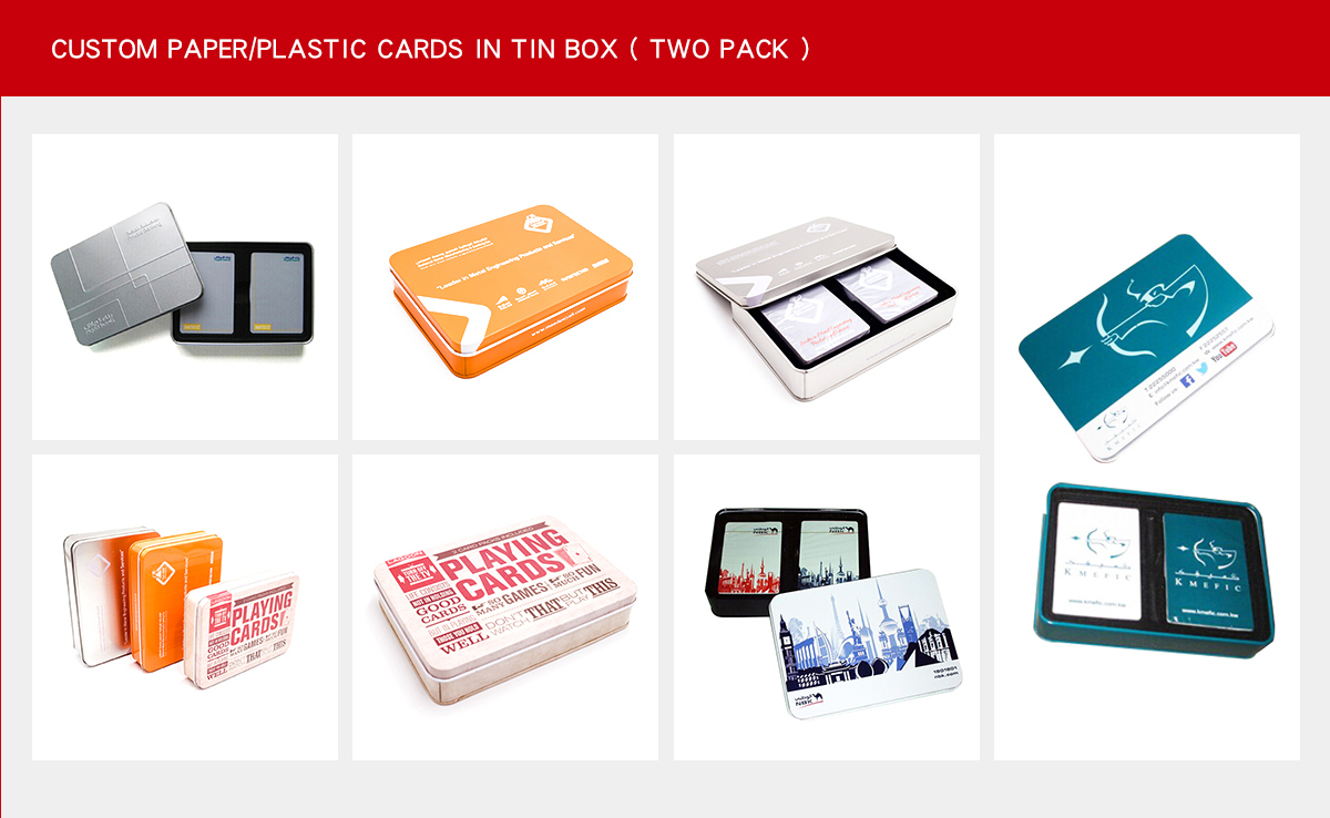 | Packing | two deck plastic playing card in a tin box |