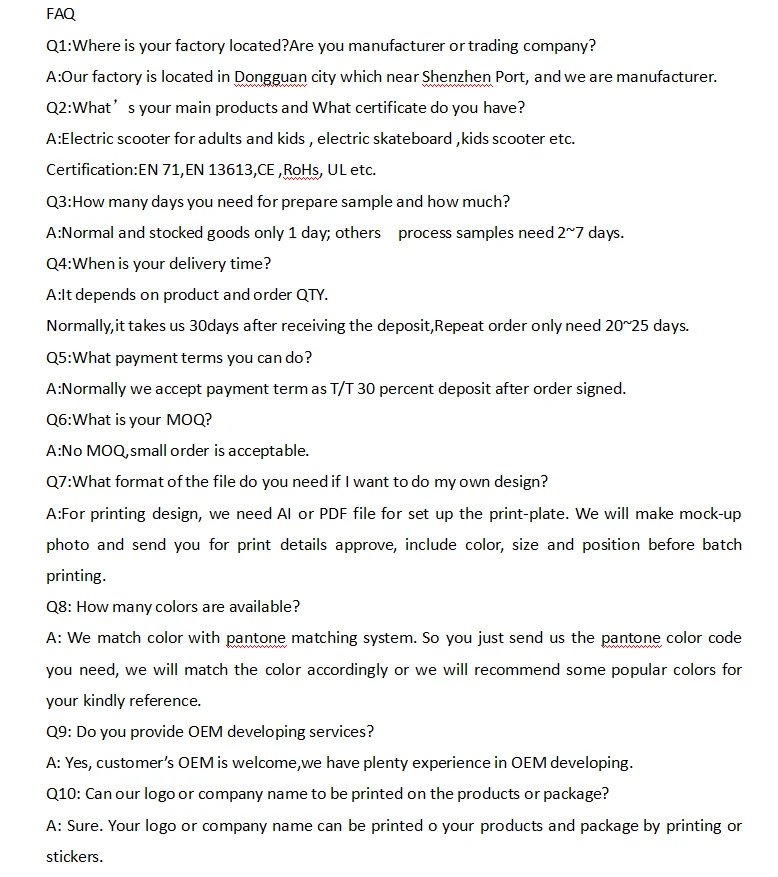 We are specialized in the production of electric scooter for adults and kids , electric skateboard and kids scooters. Our R&D team has rich experience in this series of products. The adjustment of details not only makes the product fully meet the humanized design, but also greatly reduces the after-sales problems. We have been committed to original design. With a strong sales/design/quality control team, our factory has the full confience to become your satisifed supplier.