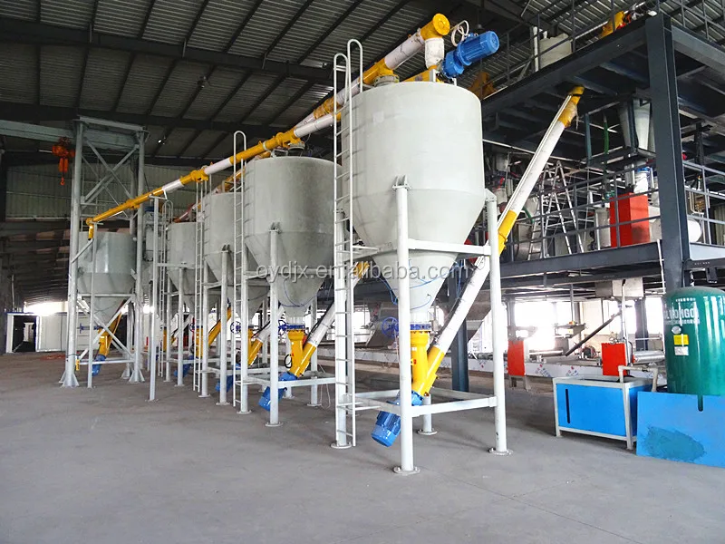At the scene, the mgo powder packaging bag needs to be transported to the top of the distribution bin through the lifting device, the top knife-cutting device breaks the bag, the magnesium oxide powder enters the distribution bin, and is transferred from the distribution bin to the five storage bins by spiral conveying. It is then helically fed to the corresponding mixer.