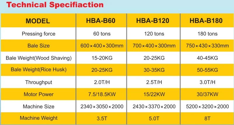 The HBA-B60 bagging baler machine comes the 30 tons pressing force for the side ram and 35 tons for the rear pressing tam,total pressing froce is 60 tons. the bale size is 600*400*300mm.the bale weight is 25-30kgs.