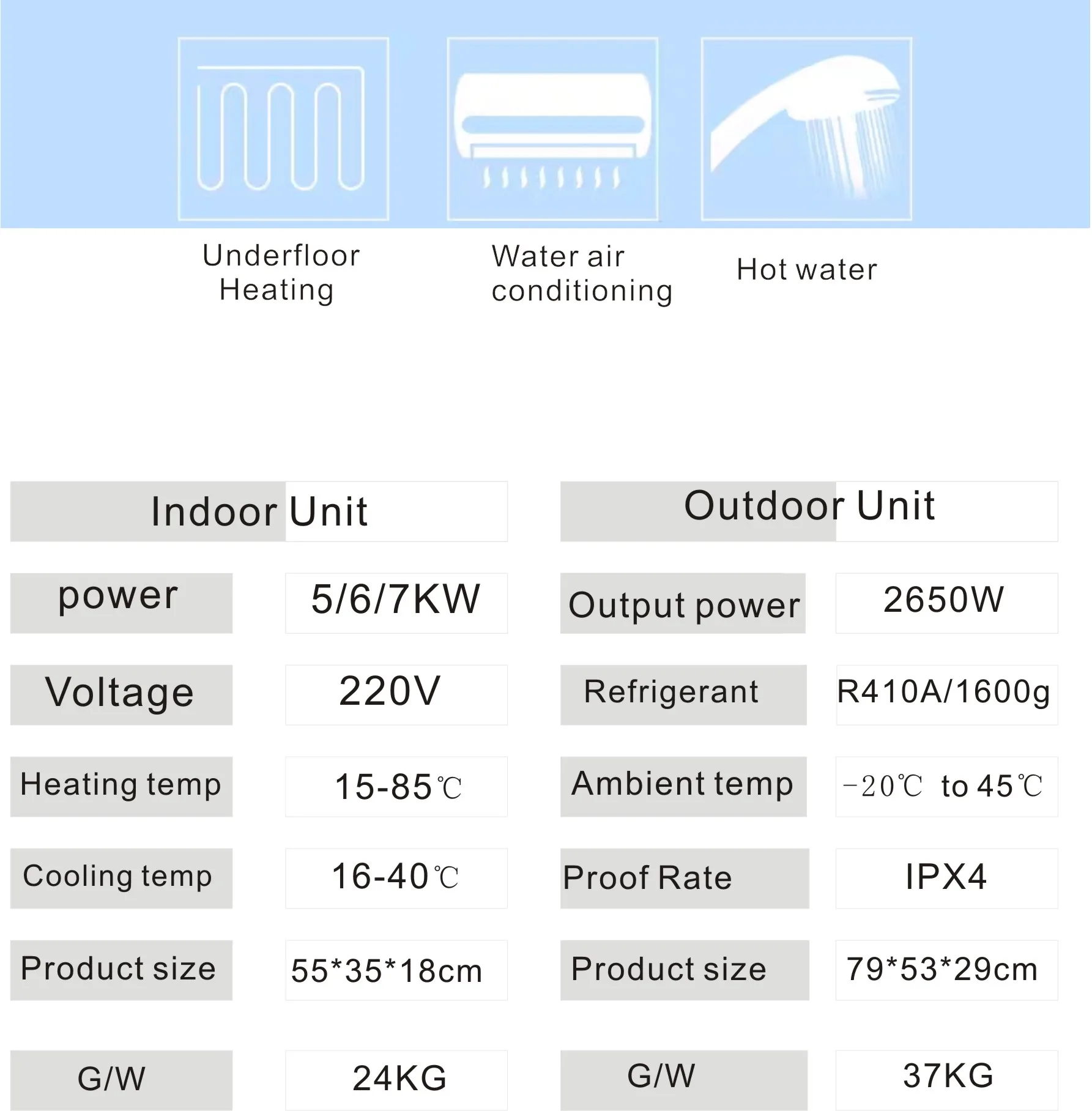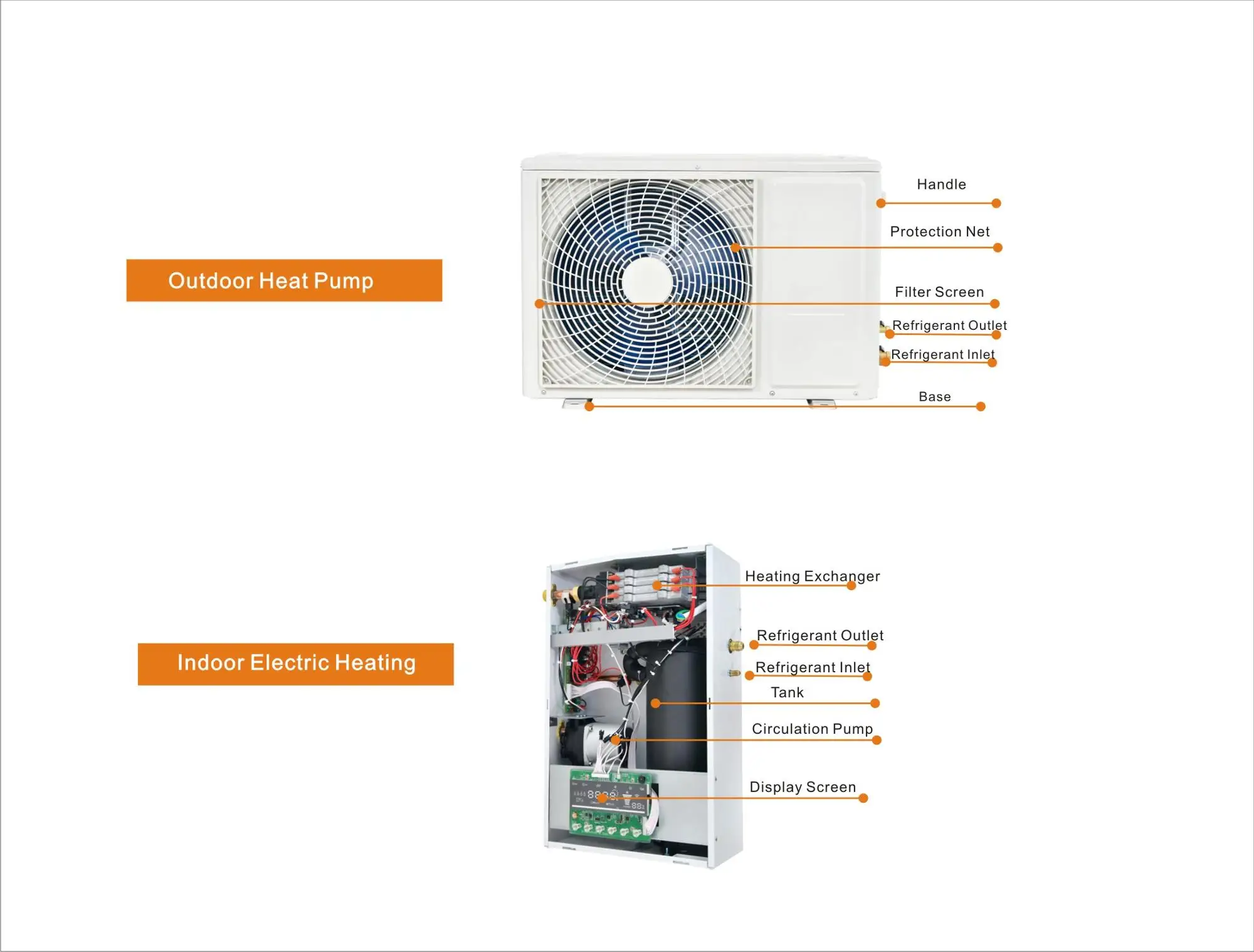 - Sealed system (With Grundfos Pump and expension vessel) - Silent in Operation - Suitable for underfloor heating and radiator\t - Suitable for Central Heating. - Fault code display Function - Thermal Cut-out - Infrared remote control - Touch operation panel,LED large screen display - Anti-freezing protect - Timing start up and shutdown function.