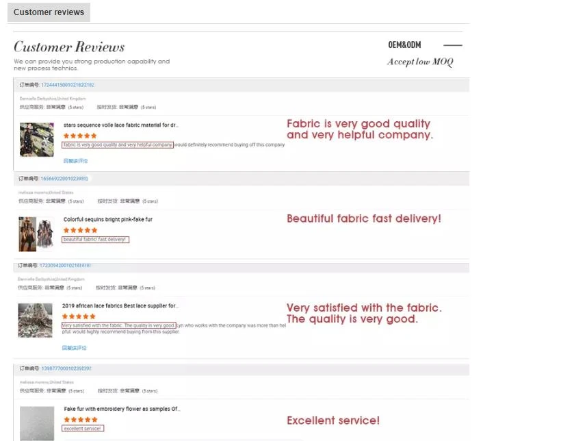 Yiwu Yaja Textile factory is a leading manufacturer in lace fabric and embroidery textiles with 10 years experience, Our products including the Embroidery Lace, 3D Flowers Lace, Eyelash Lace, Beaded Lace, Sequin Fabric, Feather Fabric, Glitter Fabric, Satin/ Mikado/ Crepe Fabric, Lace Trim and Tulle series and so on,