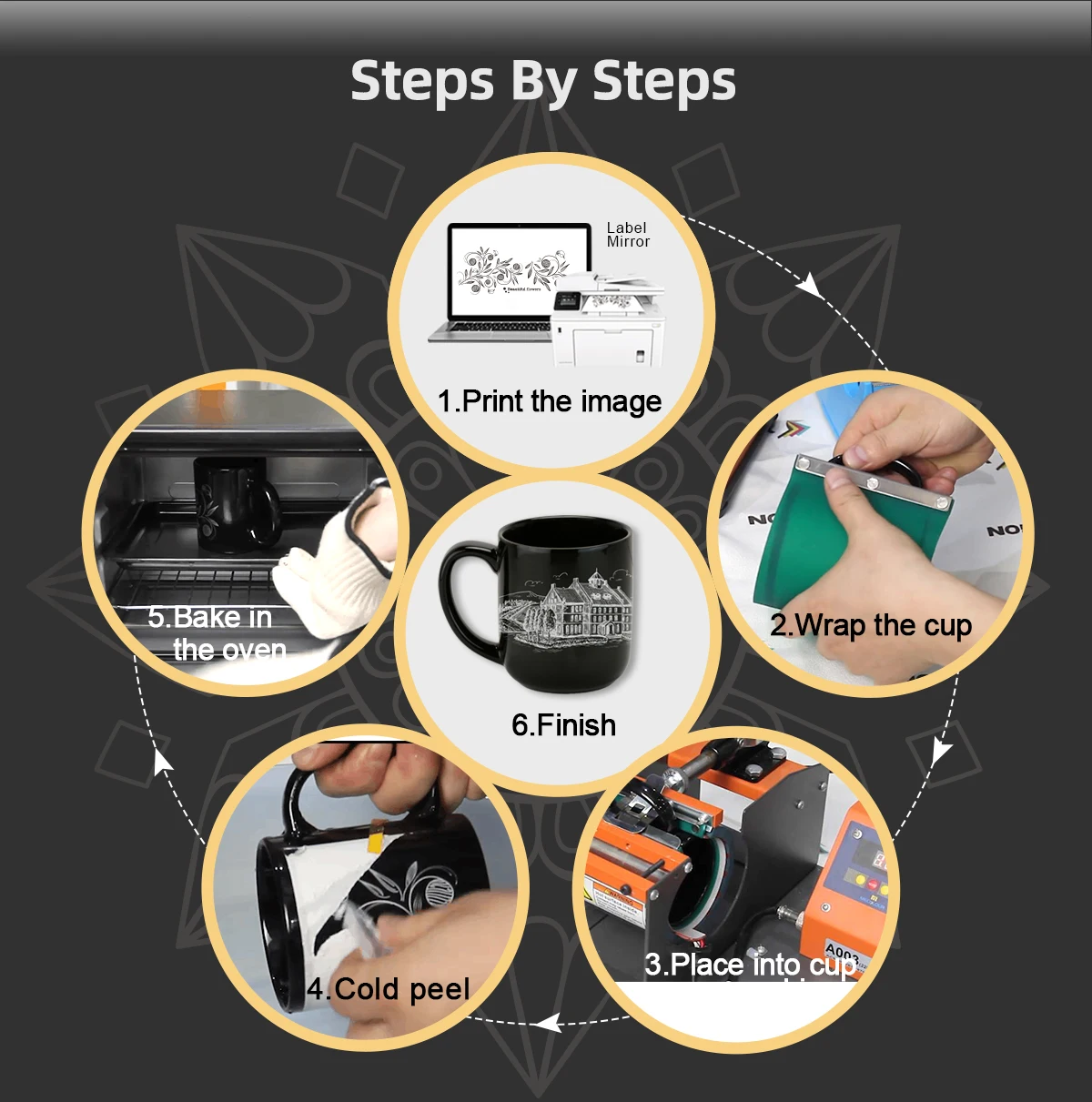 7.For baking temperature and time: the tile, cup and metal 210-220 °C, 5 minutes. 8.For the material which could not endure high temperature, adjust them flexibly in the actual operation. The principle is not to exceed the maximum temperature that the object itself can withstand. Large items that are inconvenient to be placed in the oven can be dried naturally.