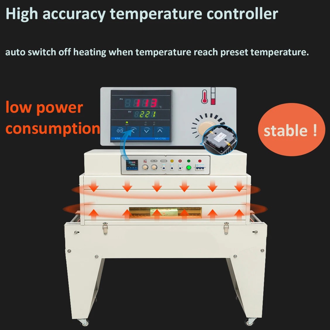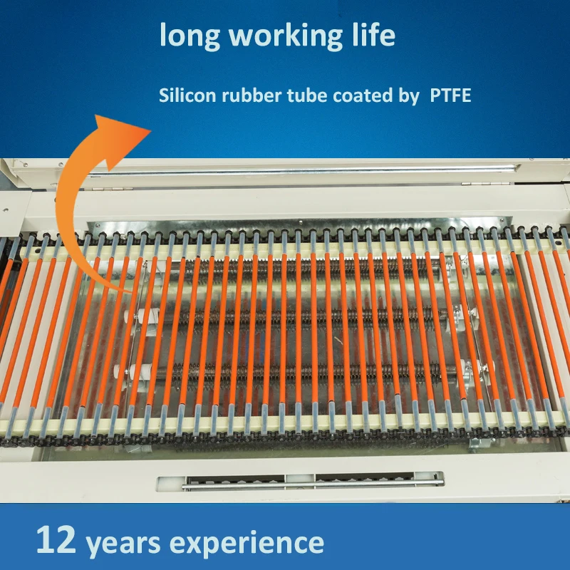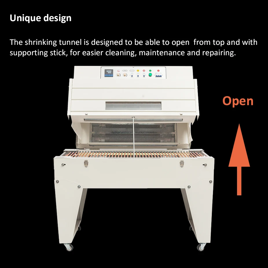 3,shrinking tunnel able to open from top, convenient for cleaning,maintenance and repairing.