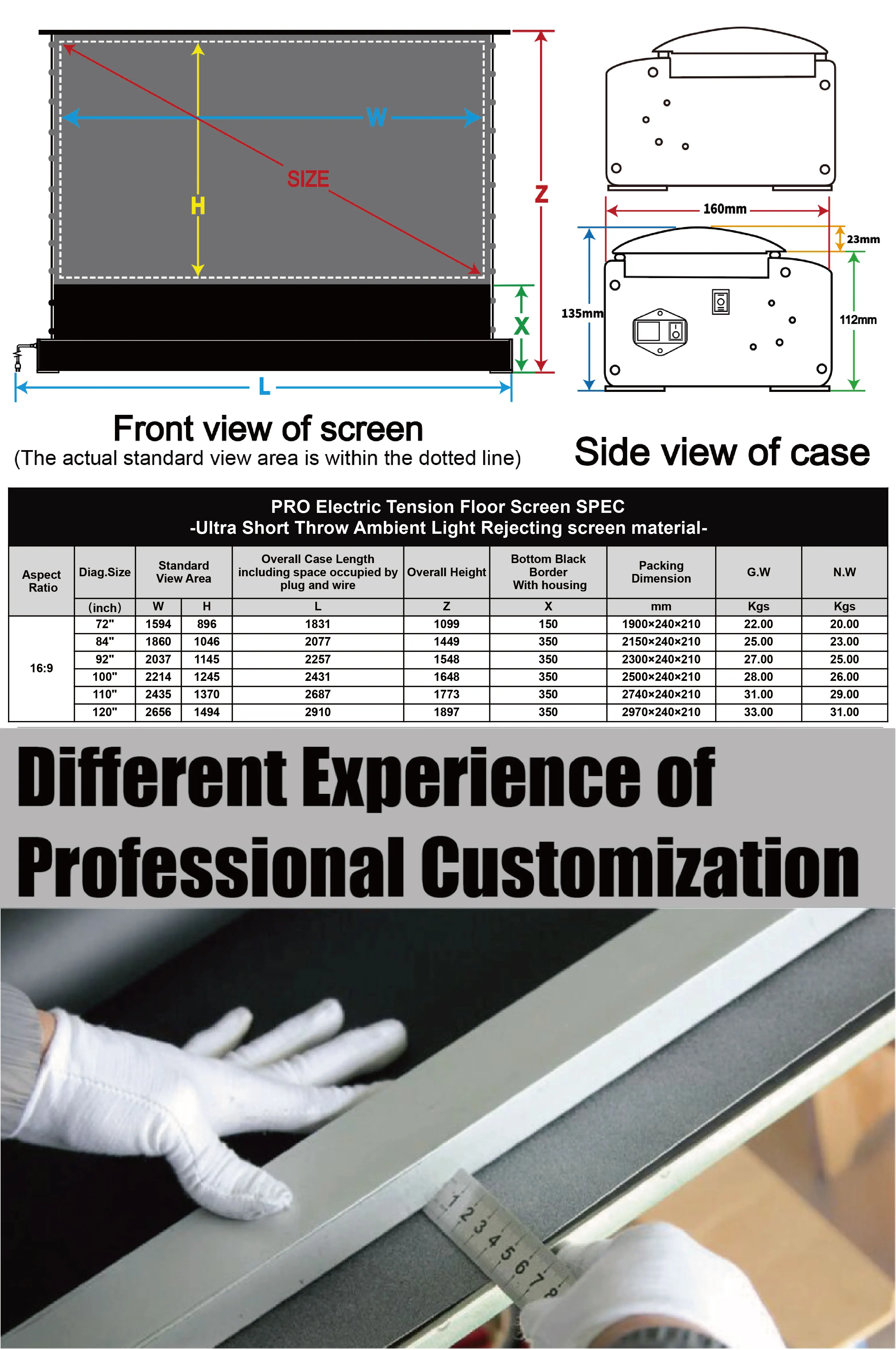 The screen has a high-density hard-core military design, which requires no punching and installation. Connect to the power cord for quick use. The PRO Electric Tab-tensioned Floor Screen is the best ideal solution for this demand.The screen material uses the Ultrashort throw Ambient Light Rejecting screen material. It is the perfect match for Ultra short throw projectors.