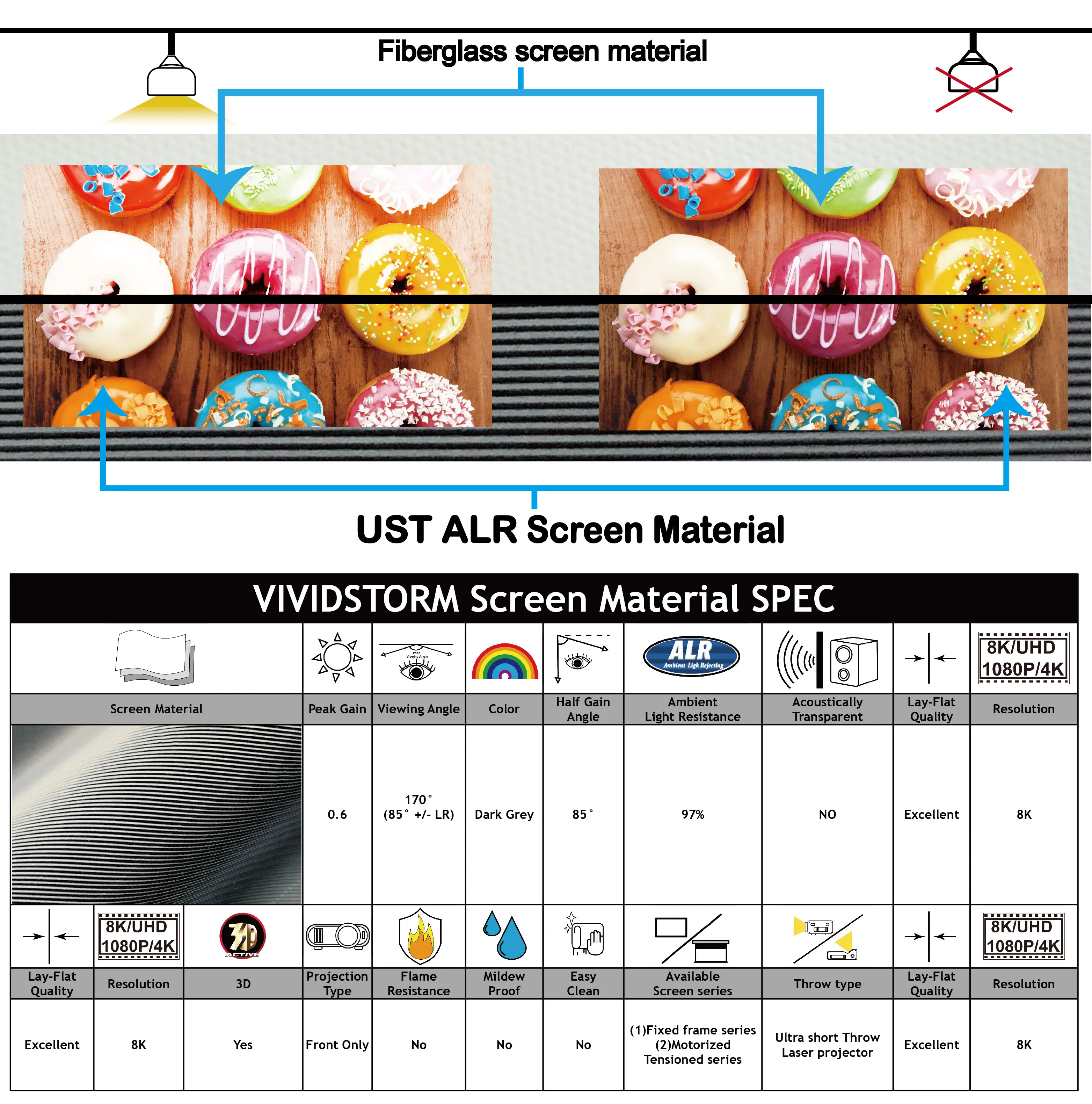 The screen material uses the Ultrashort throw Ambient Light Rejecting screen material.