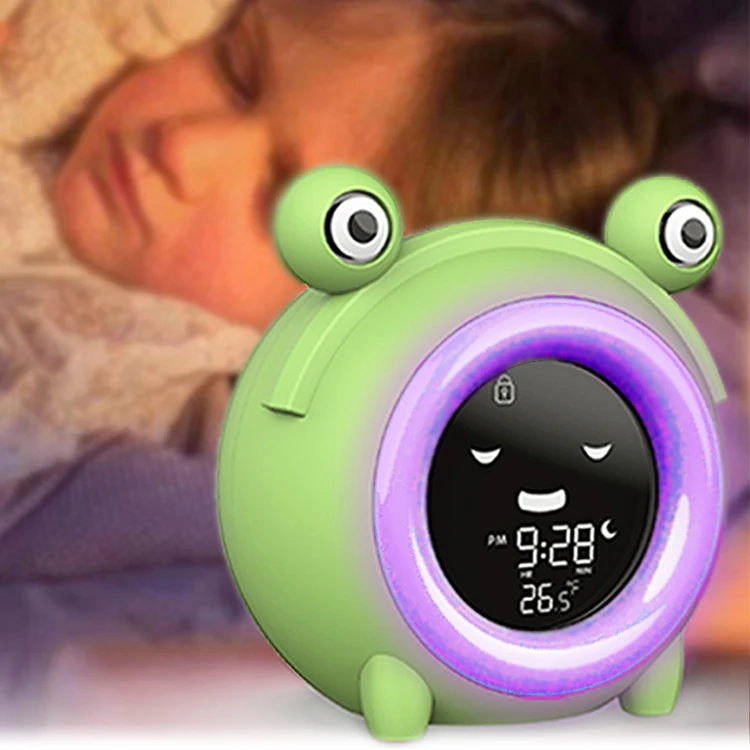 Function | 1. Sleep trainer, teaches children to wake up, has night light and music reminder function. 2. 4-bit time display: hours, minutes. 3. 12/24 option (default 12 hours) 4. 5 kinds of music alarm clock, 3 volume levels can be adjusted. 5. 5 light colors. 6. LED backlight, 4 brightness levels can be adjusted 7. 8 nap times (3:00 2:30 2:30 1:00 0:45 0:30 0:10) 8. 11 buttons: SET, TIME,ALARM, SLEEP/WAKE, SOUND, LIGHT,NAP, +, -, SNOOZE, LOCK 9. Key lock function.The default unlocking state of power on. 10. The CR2032 battery retains the basic storage function. 11. Low voltage indication 12. Snooze function, 10 minutes delay 13. Temperature display function, F/C unit selection, default F. 14. Eyes Blink three times per minute throughout. | ||||