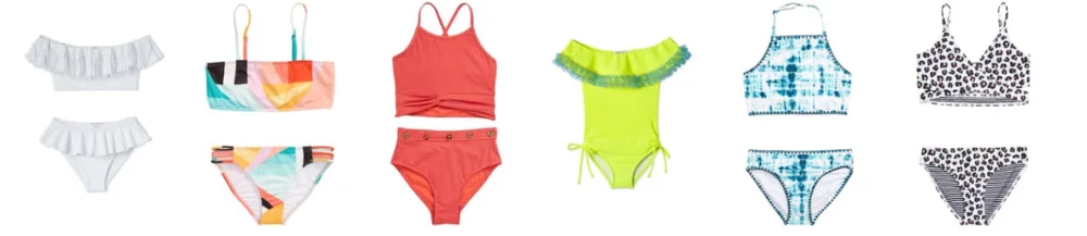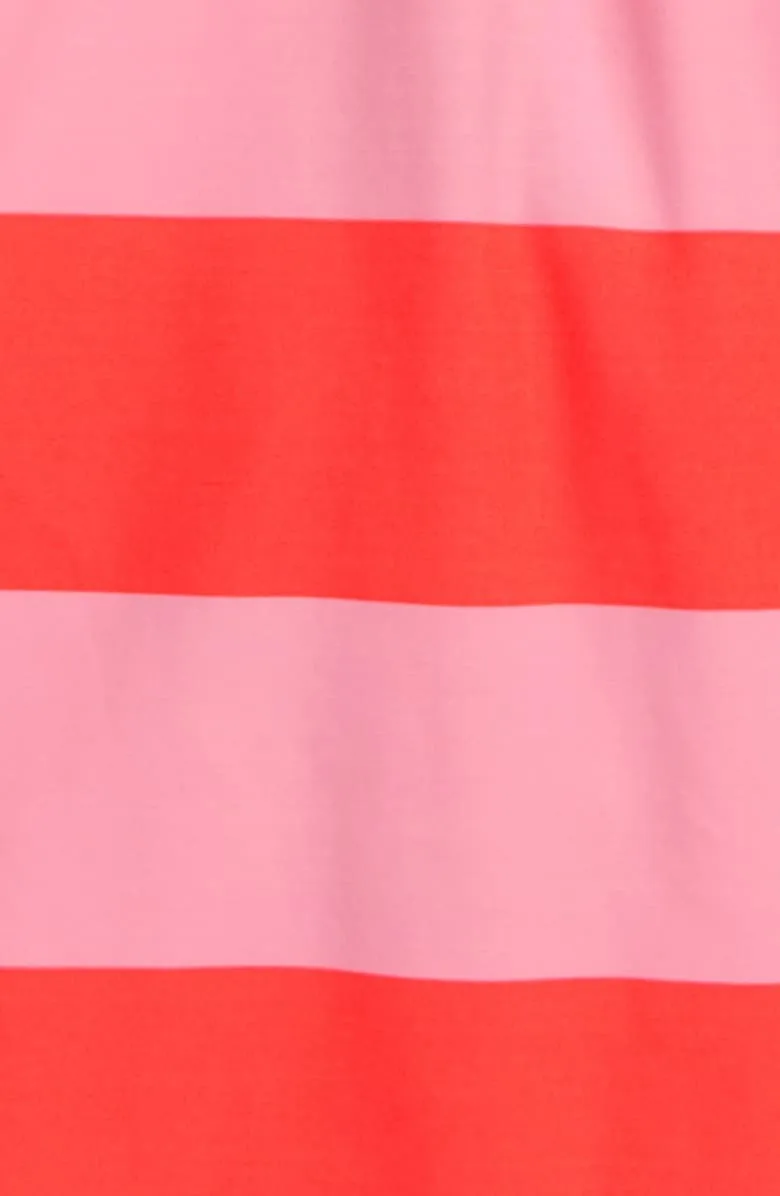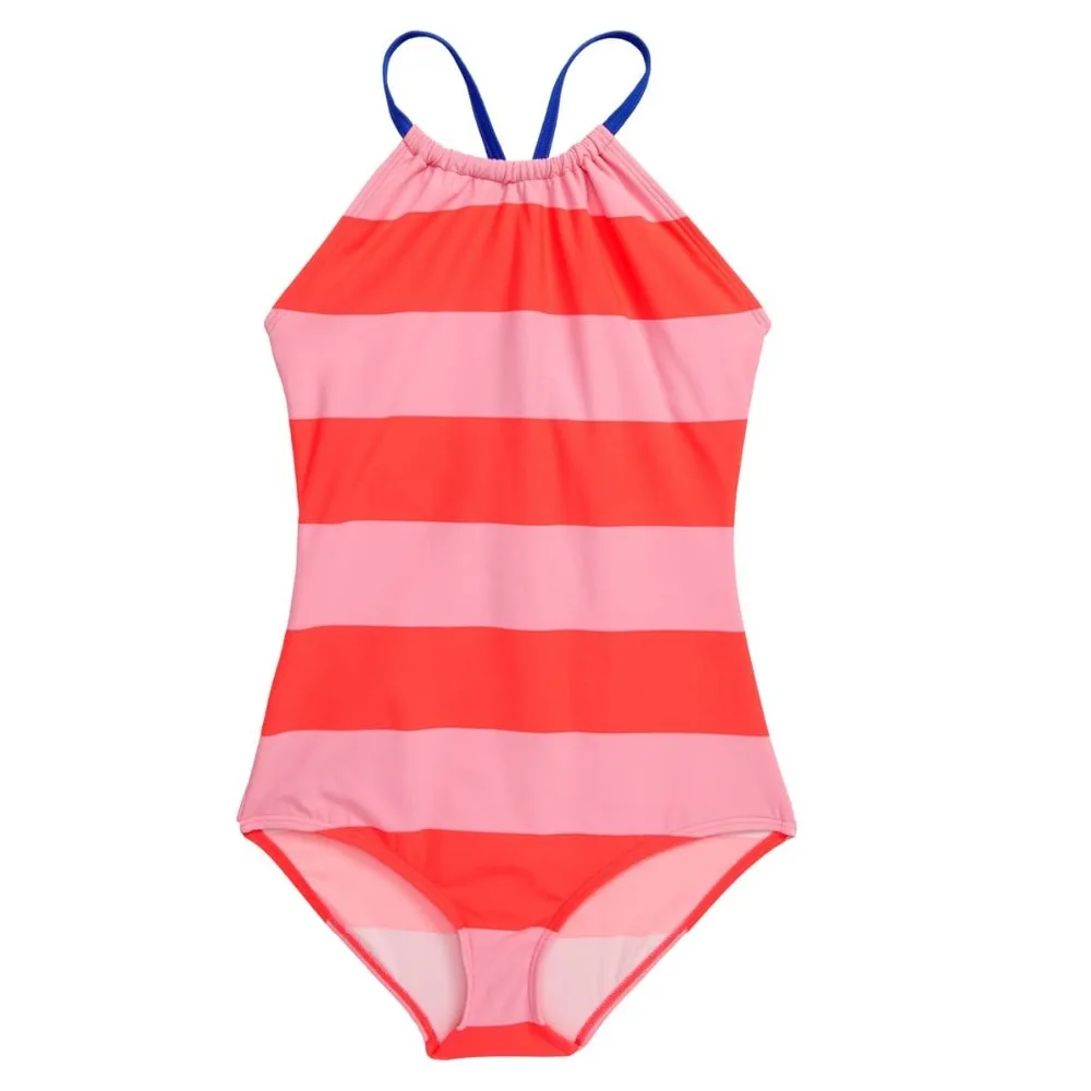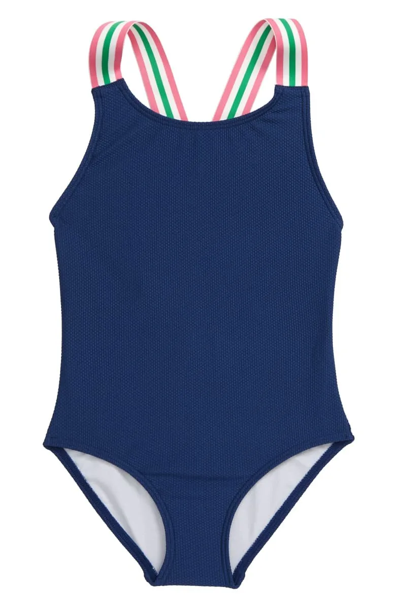 Swimwear across a color-pop background on this ruffle-trimmed swimsuit fitted with adjustable straps that crisscross in back.