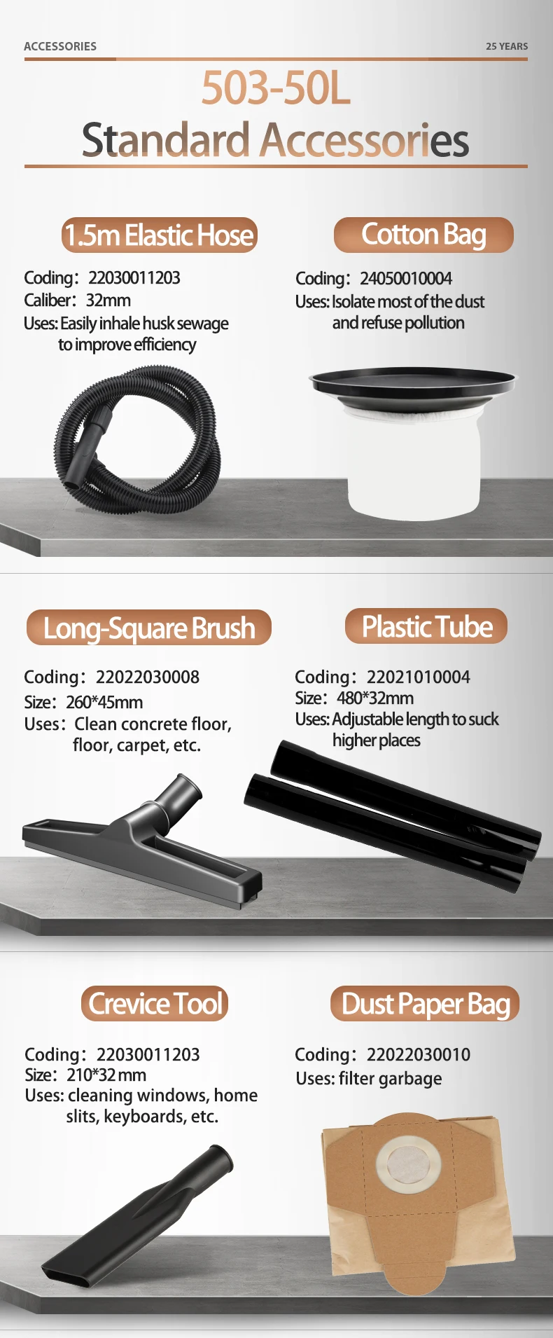 Accessories Included | ①Long-Square Brush ②1.5mElastic Hose ③2pcs Plastic Tube ④Cotton Bag ⑤Crevice Tool ⑥Dust Paper Bag | |||||