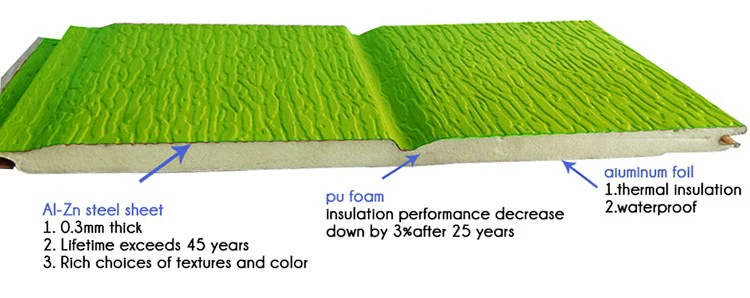Composition | Face:Al-Zn steel sheet ,Core:hard polurethane foam,Back:aluminum foil | |