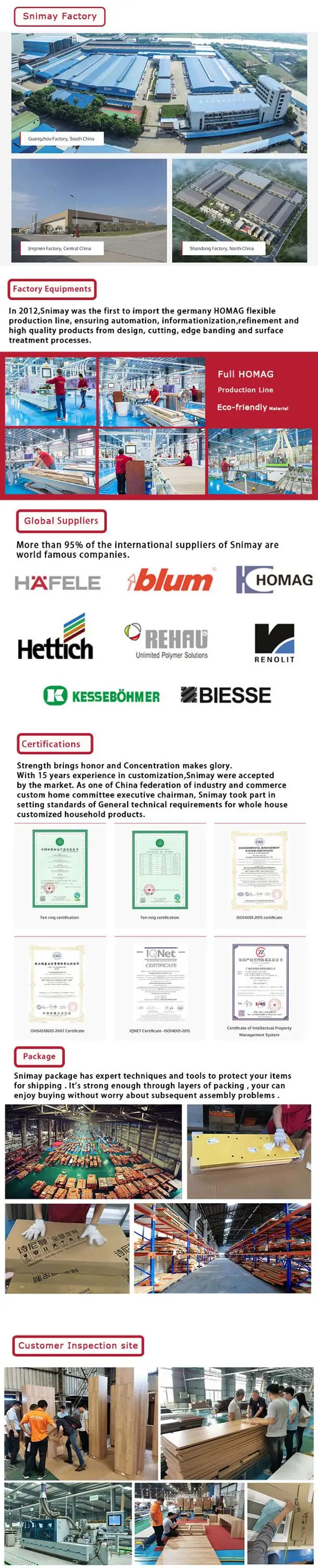 Established in 2003 , Guangzhou Snimay Home Collection Co.,Ltd is located in Guangzhou , China . As one of the leading brand of whole house custom-made furniture manufacturer in China , Snimay has 2 factories in Guangzhou and 1 factory in Hubei with a total area of more than 1,000,000 square meters , and 1200 dealers all over the world , providing kitchen , wardrobe , door & window , and whole home furniture .
