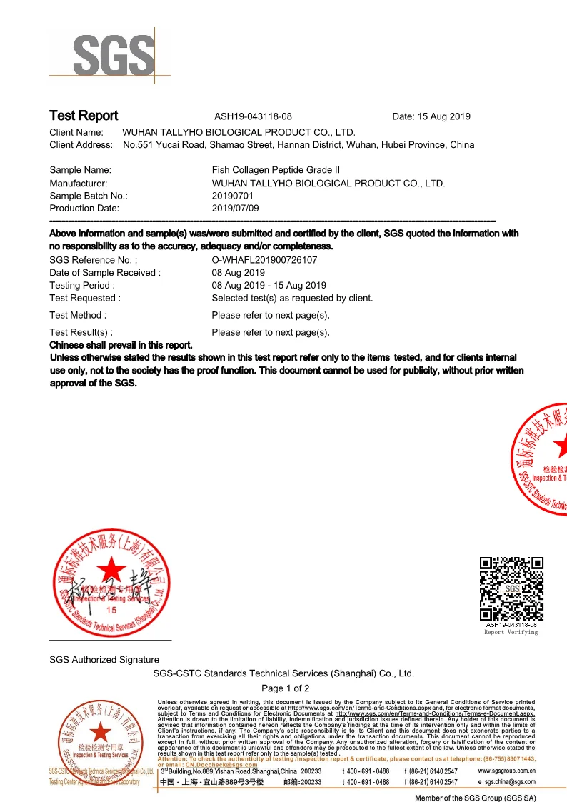 Content of collagen three peptide (relative proportion of the molecular weight of 500-200 Dal) | % | ≥ 20.0 |