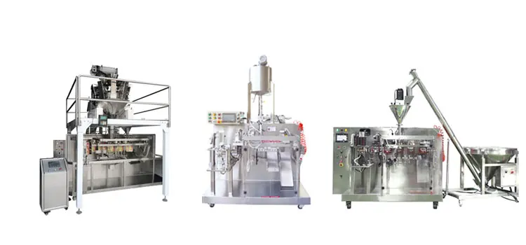 pump, auger filler, bucket chain for different kinds of product filling and packing in premade bag.