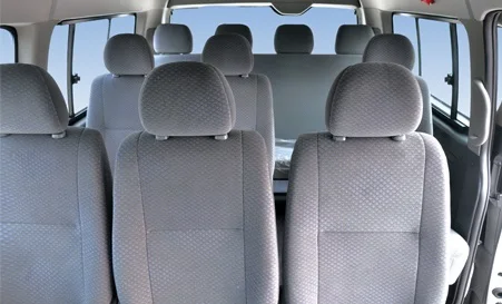 5.Passenger area: the 2nd row, 2 ( forwardly foldable seats with headrest)+1(fixed seat) 5.乘客区最后排:左侧2人座为折叠前翻座椅(带头枕),右侧为1人固定座椅 | 6.Flocking roof, simple side panel 6.植绒顶棚,简易侧围装饰板 | |||