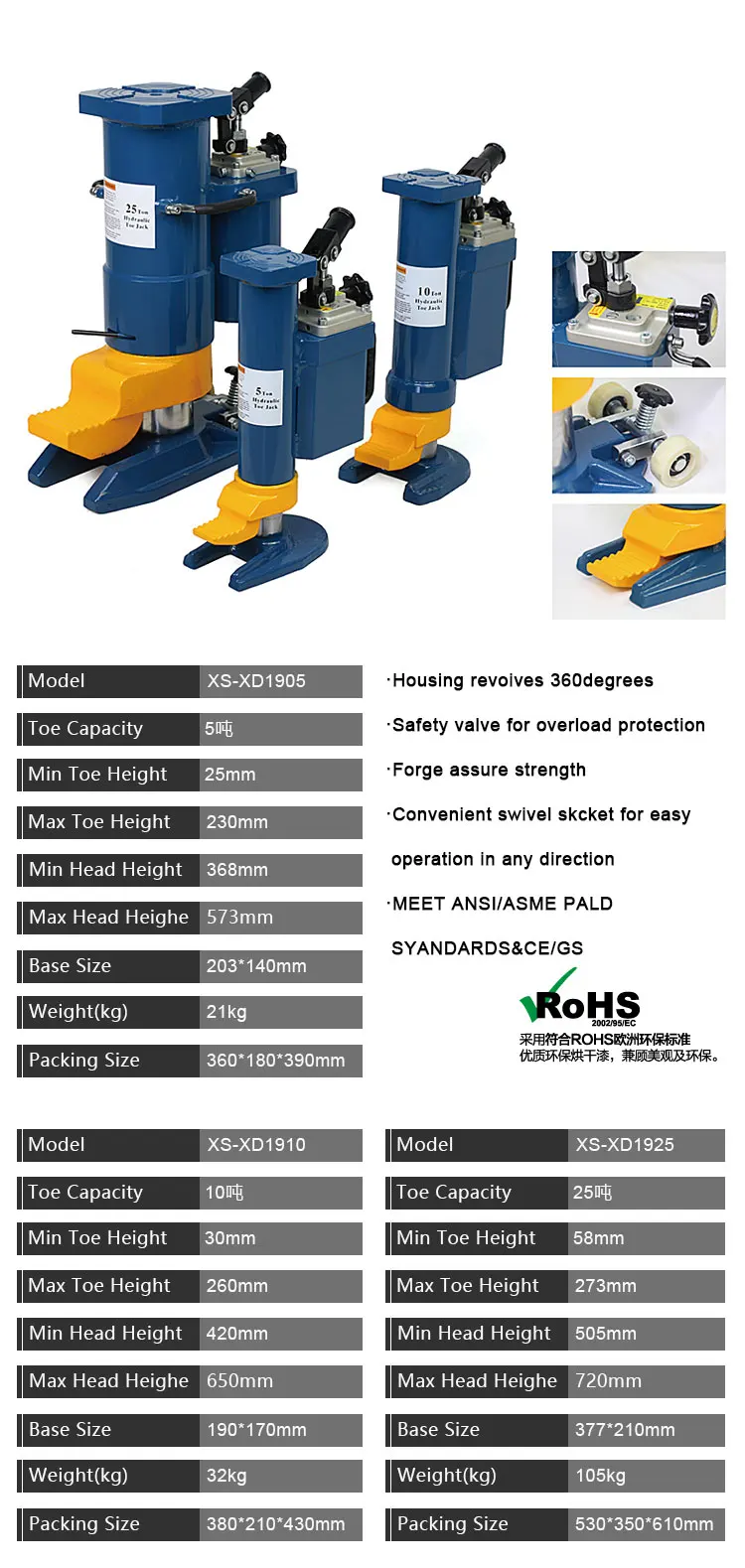 -Housing revolves 360 degrees ·Safety valve for overload protection -Forge assure strength ·Convenient swivel bracket for easy operation in any direction ·MEET ANSI/ASME PALD STANDARDS&CE/GS