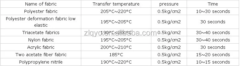 The following is the transfer printing parameters for your reference