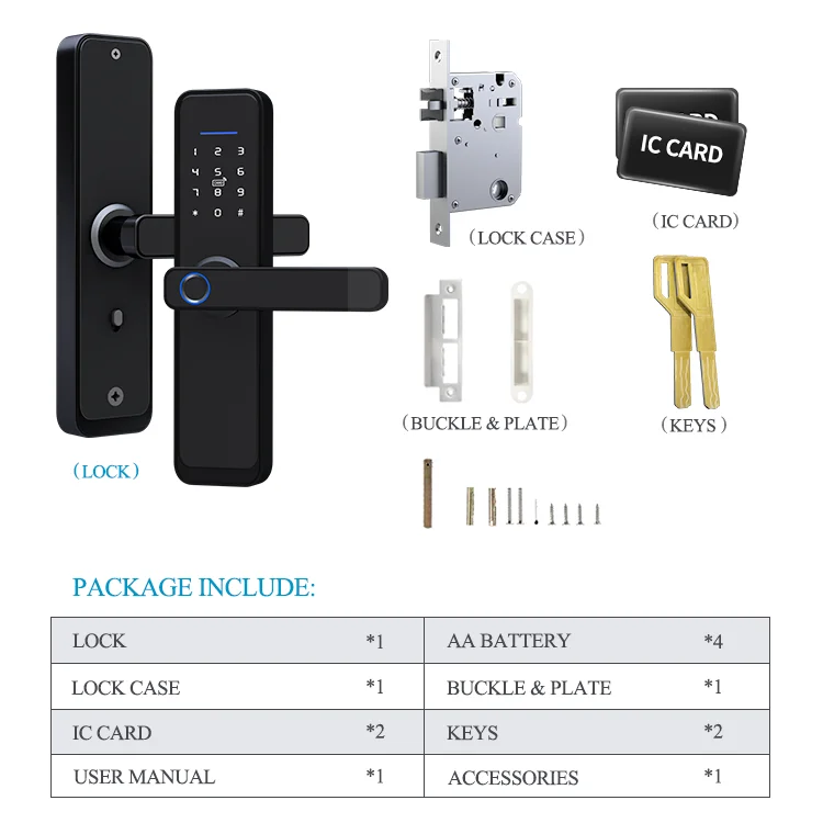 Attention and read carefully : 1. In Initial state, no unlock information is needed to unlock. Please press "*#" to set your administrator information immediately. 2. In open mode, no information is needed to unlock. Please press "5#" then enter administrator information to set it. 3. Lock gives warning alarm every unlocking when power under 4.8 V. Please change the battery in time. For emergency, you can use the key or charge it by micro USB interface at lock bottom. 4. Tuya version and ttlock version option. | ||||||