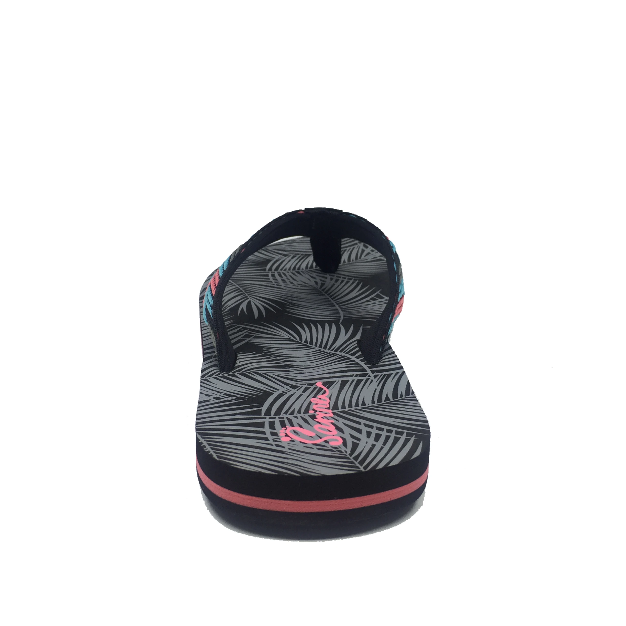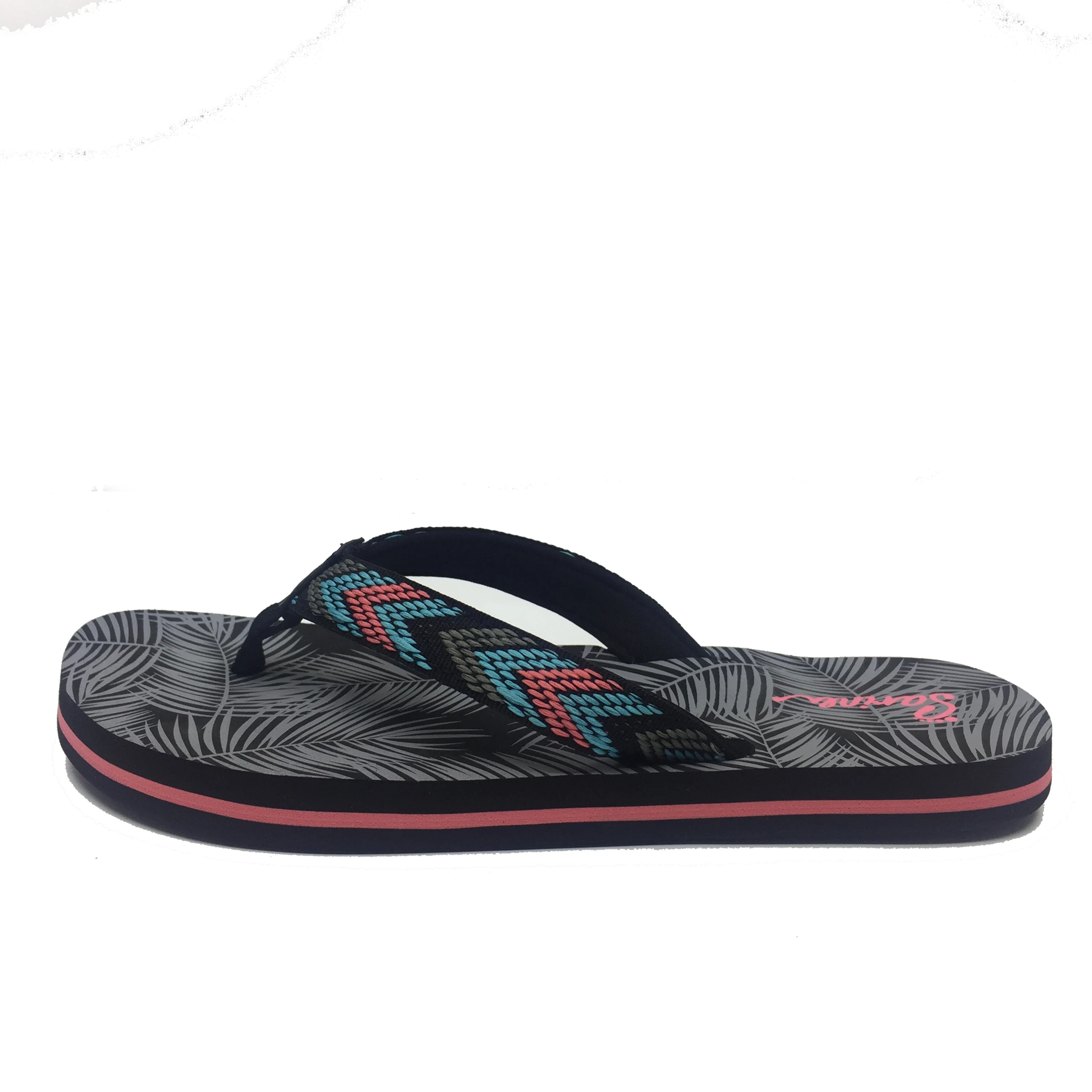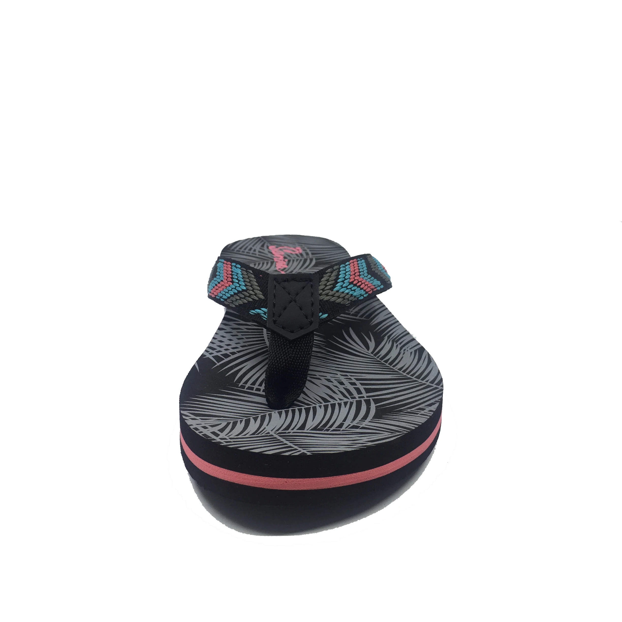 1.Title | Double color webbing strap customized palm tree silk printed soft EVA sole sheet woman nude woman flip flops |