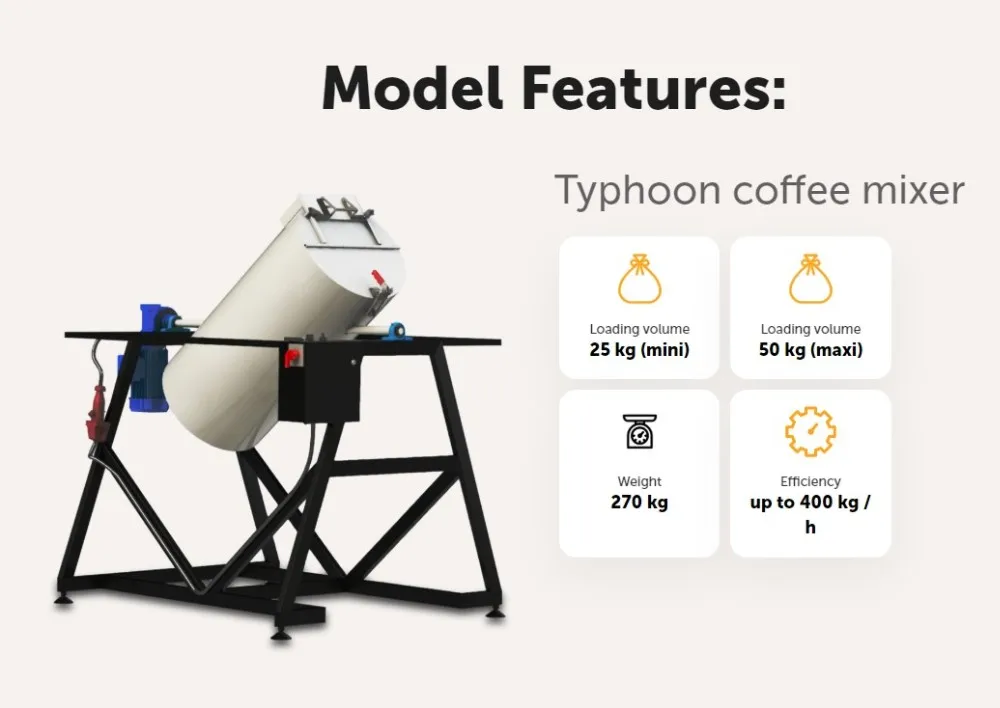 You can say from the first sight that Typhoon Coffee Mixer has very simply functionality to it but we have approached the stage of coffee processing with meticulous analysis of the needs of coffee roaster masters. As a result, our coffee mixers achieve 99% mixing consistency in blends while offering get-the-edge scope of functions such as: