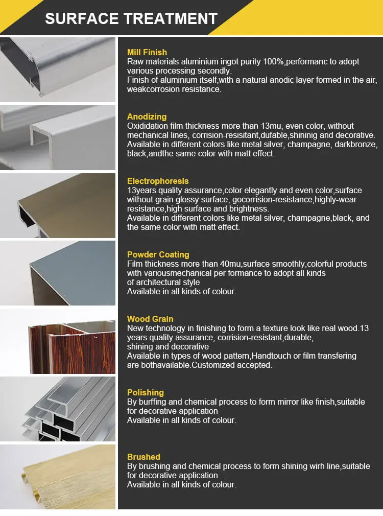 Surface Treatment | Mill finished, Anodized, Power coating, Sand Blasting, Electrophoresis, Brushed, Polishing, wood grain is also available | ||||||