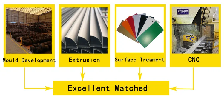 Process Flow | Mould Development--Aluminium Billets---Heating Up---Moulding with Raw Aluminium---Anodized color | ||||||