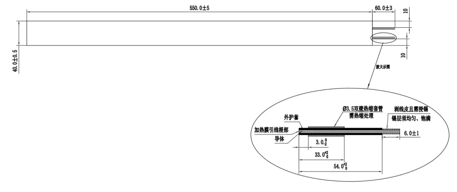 7. The main section structure of the membrane consists of PI membrane (0.08), heating body (0.05), PI membrane (0.08), with a total thickness of 0.21mm. It is firmly bonded and shall not crack within 8 years;