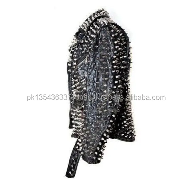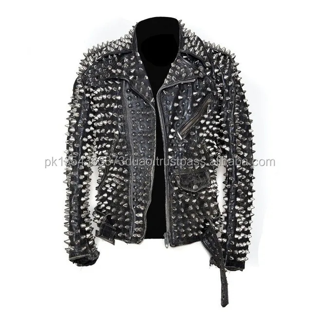 Black Punk Studded Leather Biker Jacket For Mens