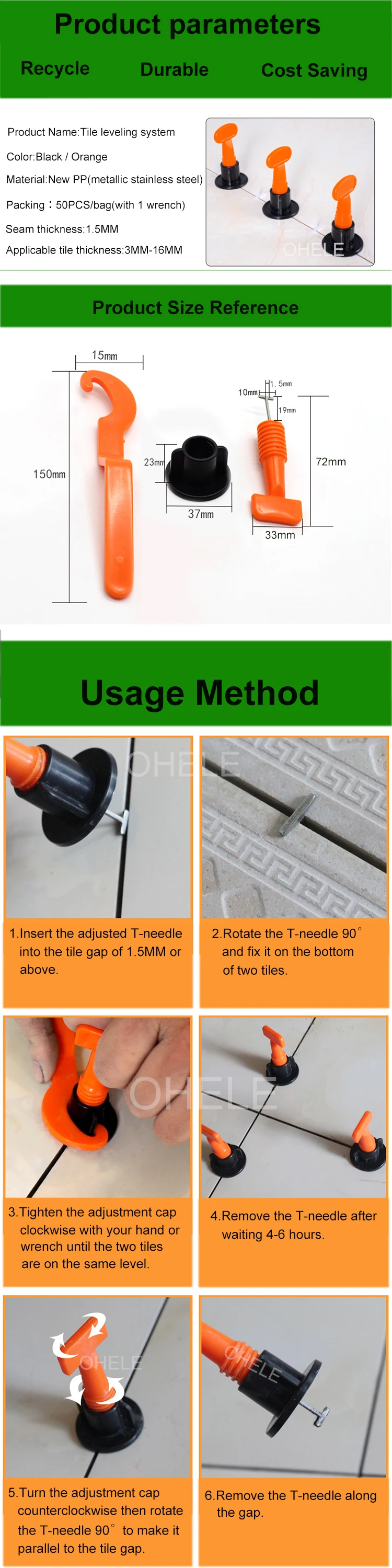 3.Suitable for 3mm to 16mm thickness of the tile, suitable for tile gap 1.5mm.