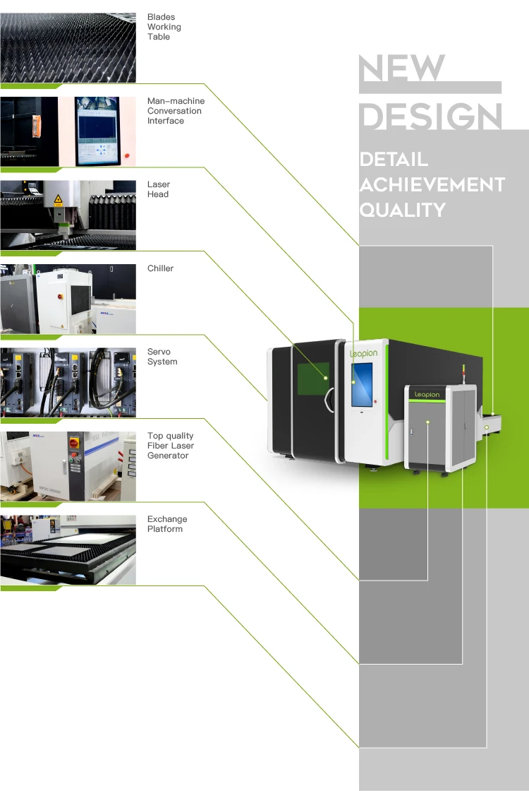 Leapion fiber laser cutting machine LF-3015PE use the world top brand parts,Raytools fiber laser head ,the laser head can automatically focus, and imported Japan Yaskawa servo motors and drives, high precision, high speed, large torque, performance is stable and durable, ensure the high speed operation of the whole machine.Chinese top brand fiber laser source Max, high power ,high precision.Top brand control system : Cypcut control system, with automatic layout optimization.