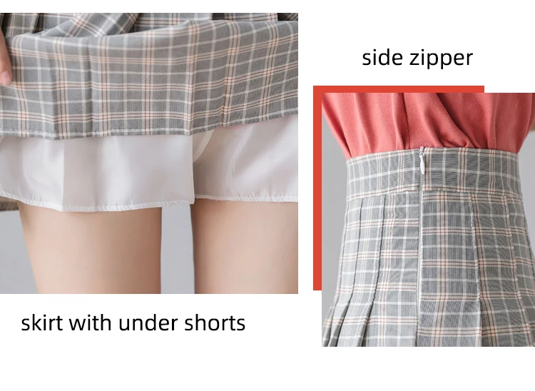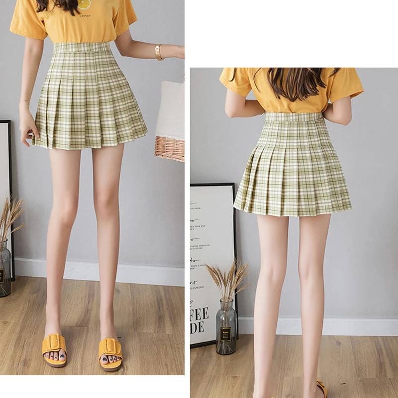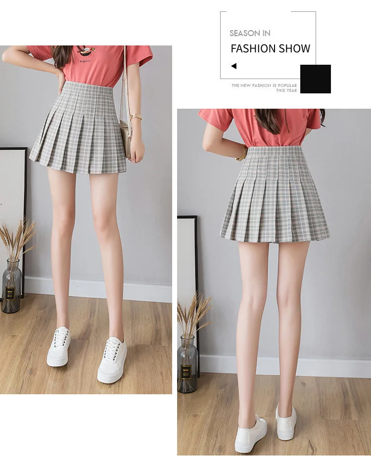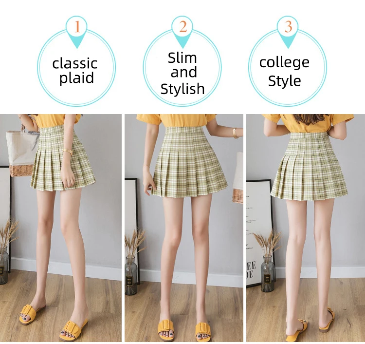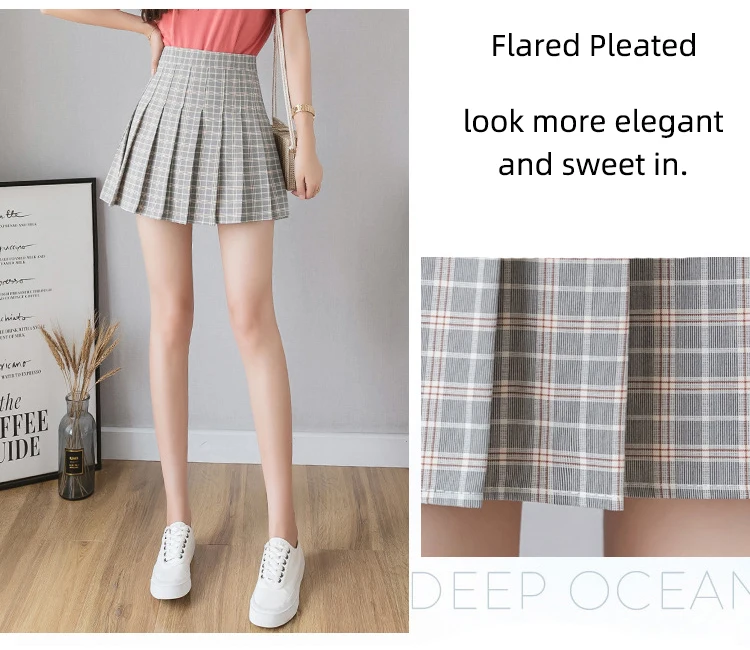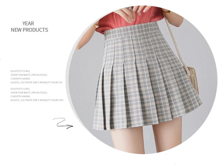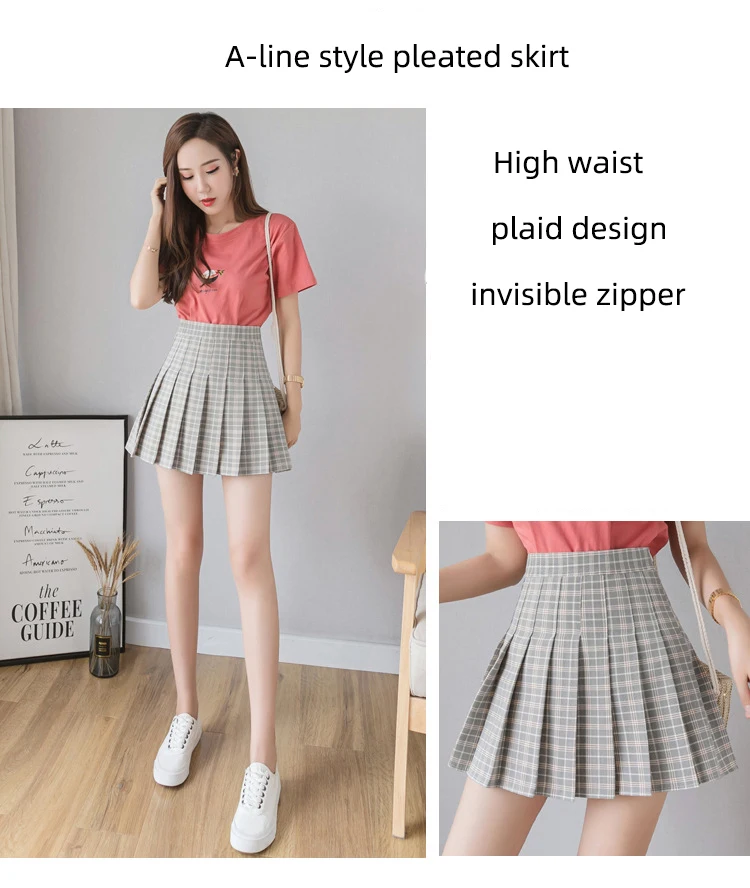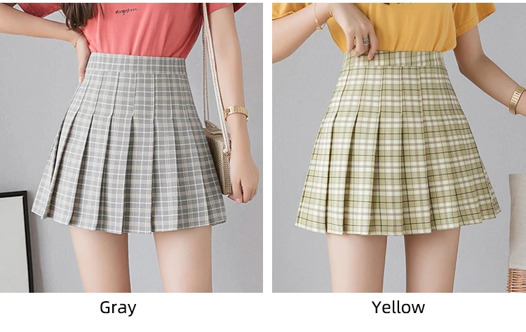 High waist, A-line style pleated skirt, solid color or plaid design, back with invisible side zipper.