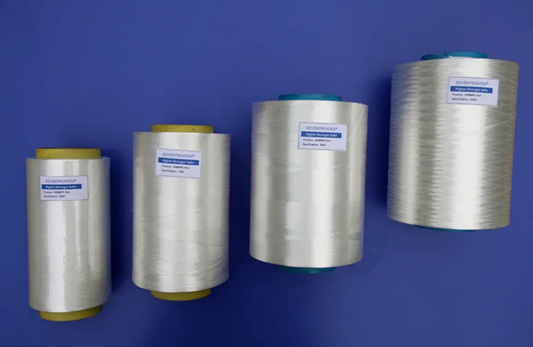 DOYENTRONTEX fiber is UHMWPE (Ultra High Molecular Weight Polyethylene) fiber developed by Beijing Tongyizhong New Material Technology Corporation. DOYENTRONTEX fiber has a unique combination of properties. The density is slightly less than 1 g/cm3, so the fiber floats on water. Meanwhile, the tenacity of the fiber is the highest in the world and can be up to 15 times that of a good quality steel. The modulus is very high and second only to that of special carbon fibers grades. Elongation at break is as low as for other high performance fibers, while the energy to break is very high due to high tenacity. Nowadays, DOYENTRONTEX fiber has been widely used in anti-cut gloves, fishig lines, marine ropes, etc.