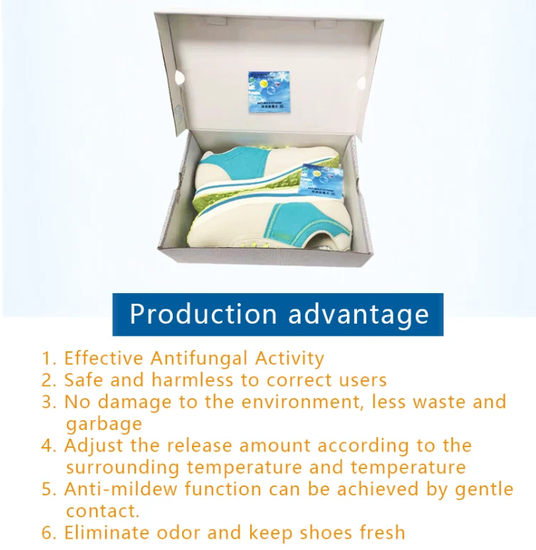 Usage: stick in shoe box for anti-fungess /mold/ mildew/ moisture/ bacterial