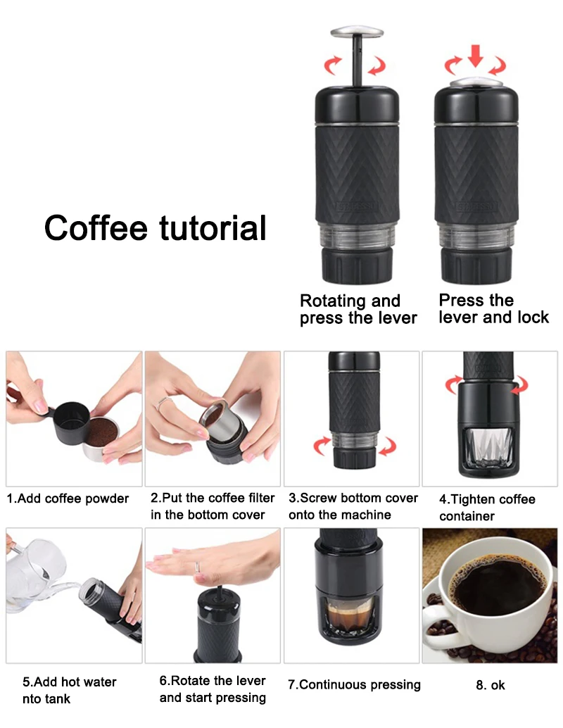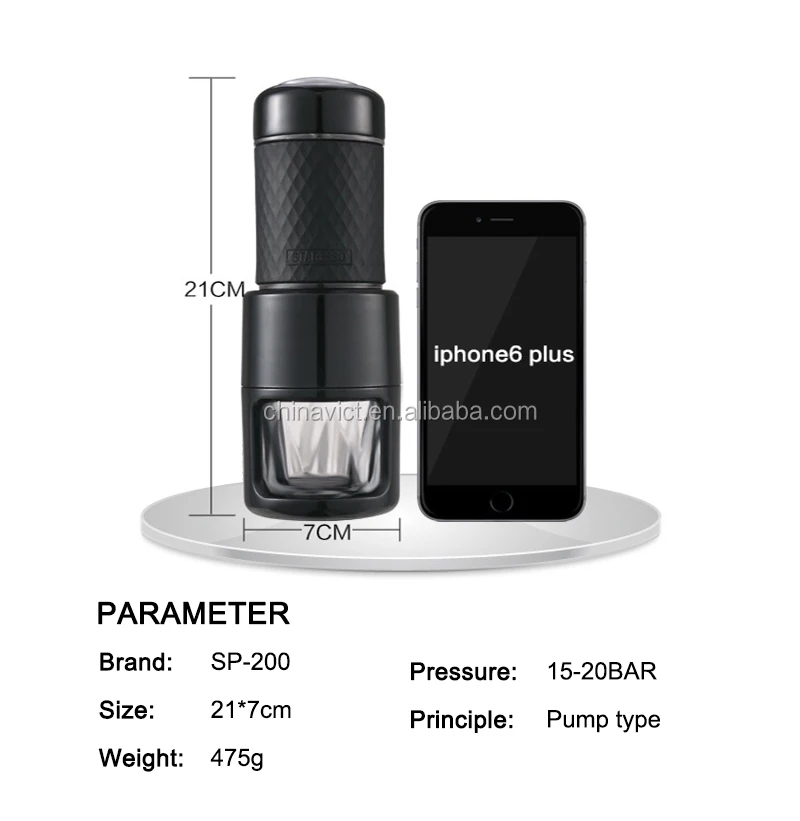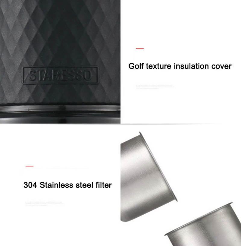 Specification: Brand: STARESSO Model: SP-200 Color: Black Size: 204 x 71 x 71 mm Maximum operating pressure: 25 bar Operating pressure: 15-20 bars Amount of coffee: 10g Water tank capacity: 80ml Tank material: PCTG Main material: 304 stainless steel Net Weight: 460g Frequency button to make coffee: Espresso: every 2-3 seconds French Café: every 4-5 seconds Frequency button to get frothy milk: every 4-5 seconds The main function: making espresso, milk foam, making cappuccino, American coffee and Coldbrew Note: Turn the sheet metal from the top left to show the pressure bar, and right to collect it.