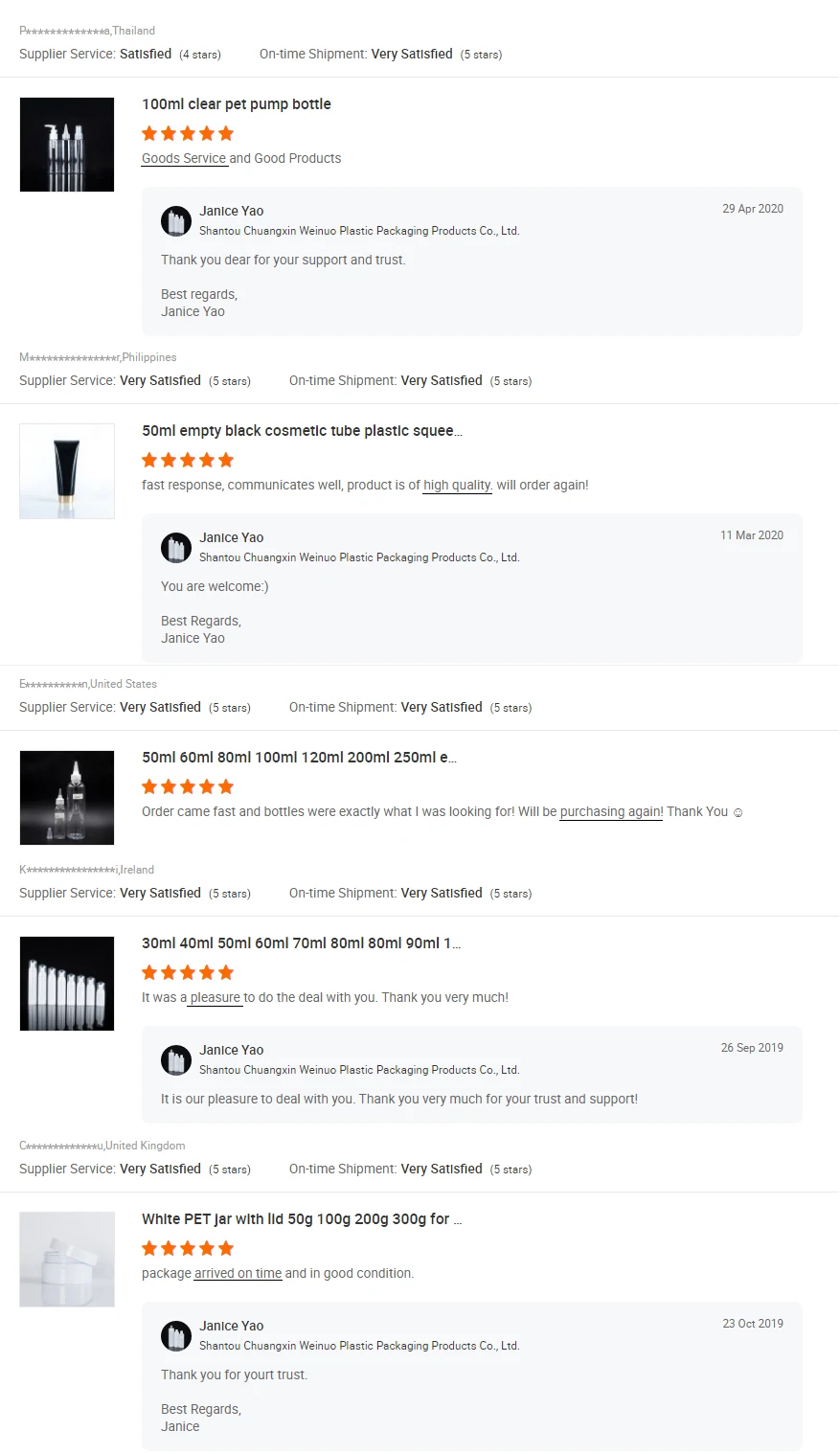 1>. What is the MOQ? Normally all the bottles we have abundant stock. So the MOQ is one full carton for both plastic bottle. 2>. What's material plastic you can do? Material can be PP, HDPE, PET, PETG, LDPE, ABS and PS. 3>. Can we do printing on the pet bottles or jars? Yes, you can. We could offer various printing ways: the screen printing, hot stamping, painting, UV coating etc. 4>. Can we get your free samples? Yes, we can offer free sample for your reference. But you should pay samples express fee . 5>. What is your payment term? T/T, L/C, Western Union, PayPal are accepted . 6>. What is your shipping way? We will help you to choose the best shipping way according to your detail requirements. By sea, by air, or by express, etc. 7>. What is the normal lead time? For OEM products, the delivery time is 30-35 work days after we receive your payment. For stock products, the delivery time is about 5-7 days. 8>. What's information you need to have a quotation? Your items' height, diameter, weight, material, packaging details, LOGO printing file. | ||||||||