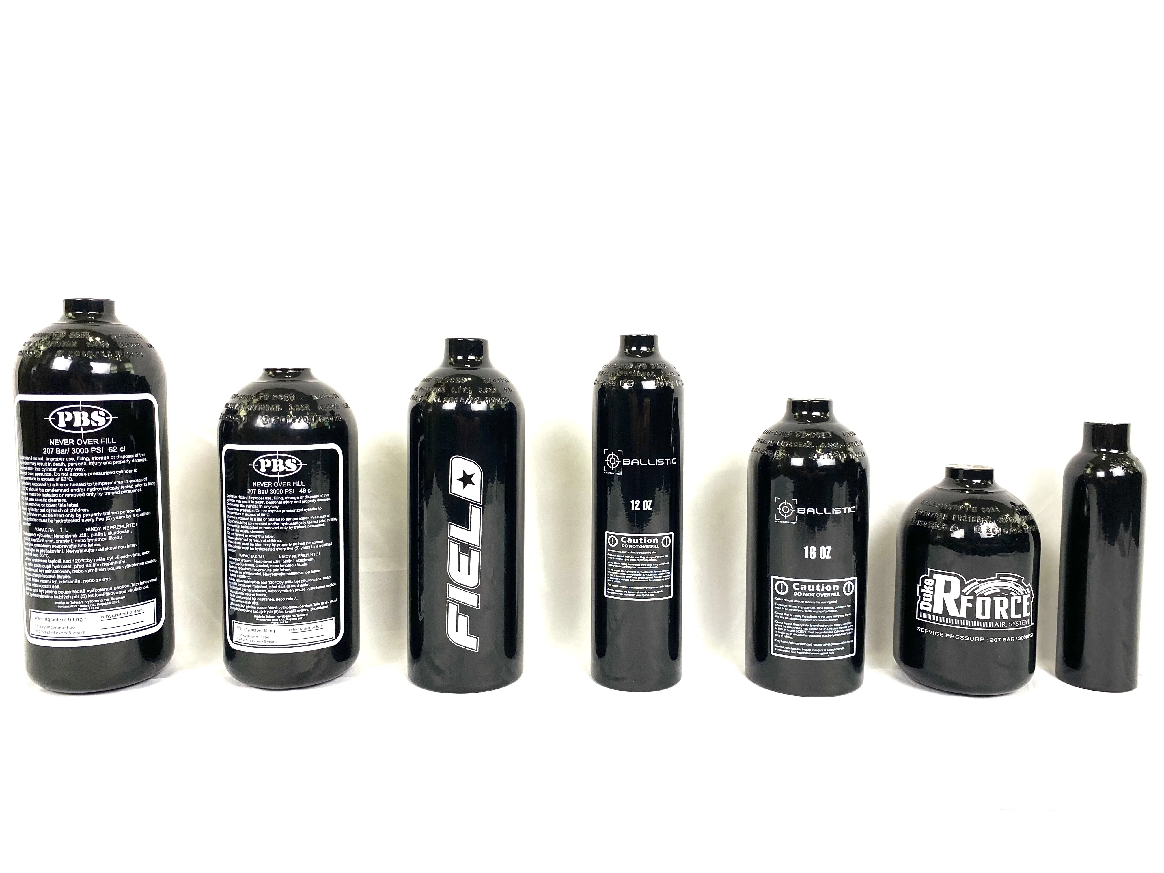 The 6061-T6 aluminum alloy tank is refilled with carbon dioxide at a pressure of 1,800 PSI and tested at 3,000PSI. Air system of the cylinder is refilled with air at a pressure of 3,000 PSI and tested at 4,500 PSI.