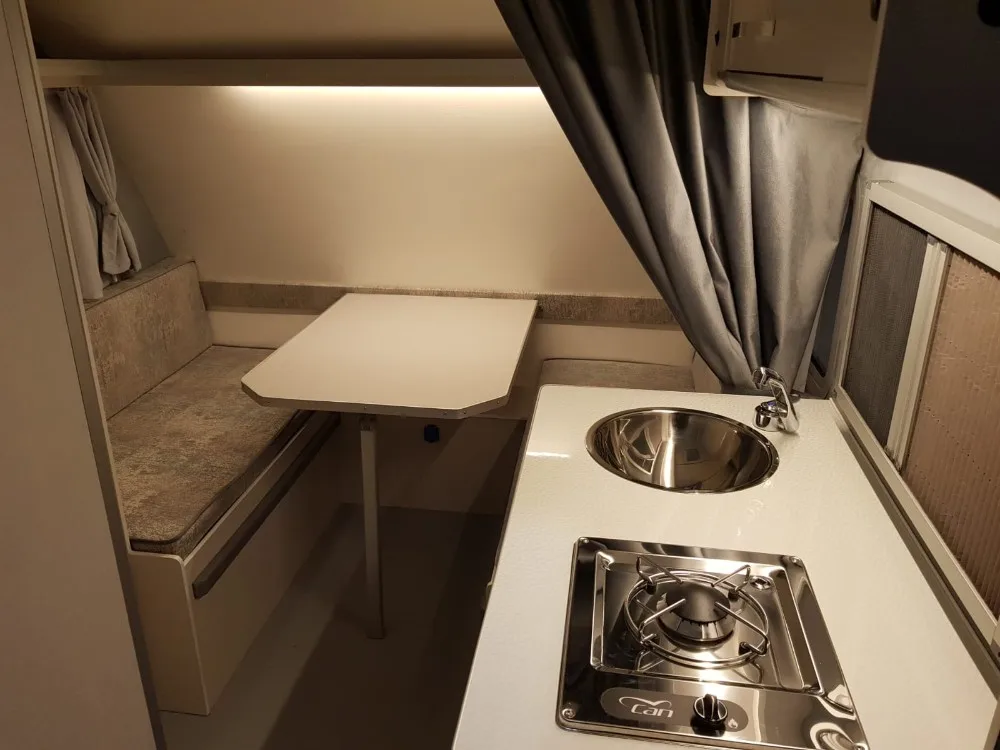 COLOR(WHITE 01 - CREAM 02- CHAMPAGNE 03-GREY 04)\t Fuse box\t Sun shade and mosquito nets window sized for kitchen\t Interior Led Lights\t Alloy Rims and tyres Dometic ventilation with mosquito net 40x40 cm\t French Bed for 2 person\t Table with sofa set\t Shower cabinet\t LED Signalization\t Clean water 60 Lt. (tank, sink and tap)\t ALKO Brakes with 750 kg. axle\t ALKO Corner Steady (Parking leveler)\t Matresses, Curtains, Fabric upholstery\t 7 or 13 pins socket for car connection\t Single Burner Hob With LPG inst.\t Battery 60 Ampers and charger 90 lt. mini refrigerator
