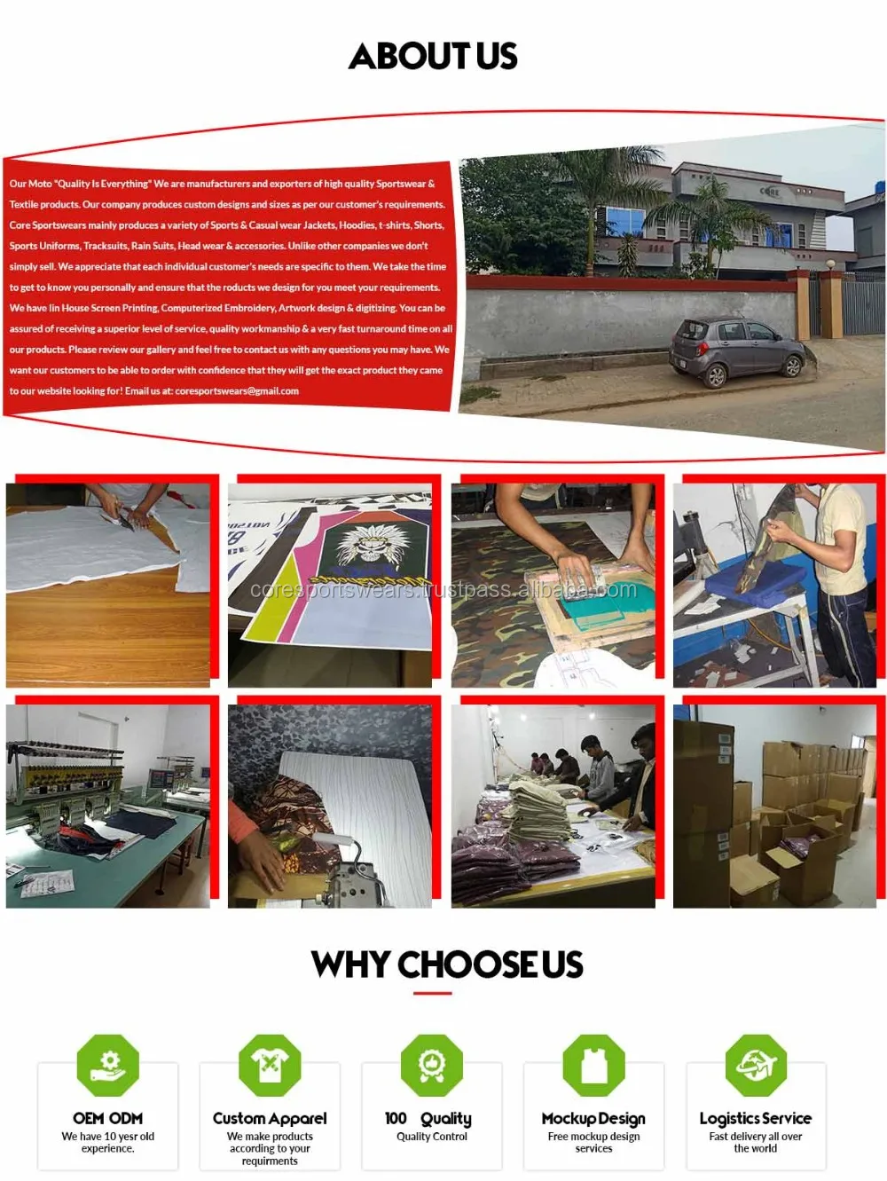 Our Moto "Quality Is Everything" We are manufacturers and exporters of high quality Sportswear & Textile products. Our company produces custom designs and sizes as per our customer's requirements. Core Sports wears mainly produces a variety of Sports & Casual wear Jackets, Hoodies, t-shirts, Shorts, Sports Uniforms, Tracksuits, Rain Suits, Head wear & accessories. Unlike other companies we don't simply sell. We appreciate that each individual customer's needs are specific to them. We take the time to get to know you personally and ensure that the products we design for you meet your requirements. We have in House Screen Printing, Computerized Embroidery, Artwork design & digitizing.