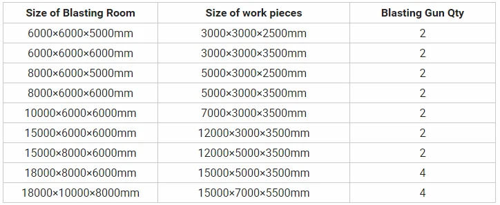 This machine is a special sand blasting room for vehicle. It is composed of shot blasting chamber body, shot blaster, screw conveyor, elevator, separator, manual door opening, lighting system, shot supply system, air storage tank and oil-water separator, dust
