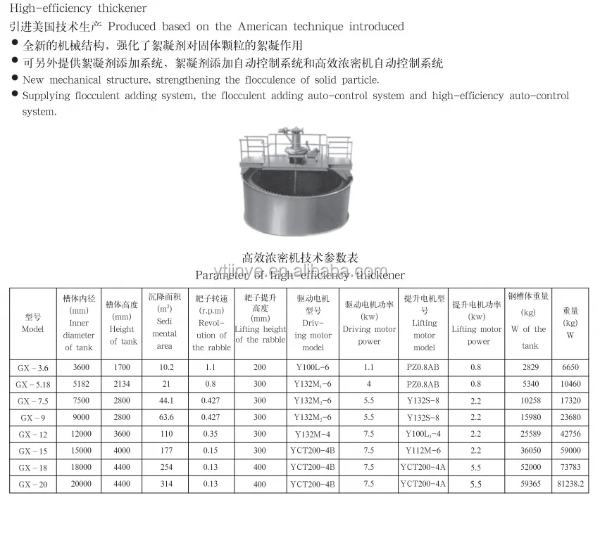This thickener consists of round thickener and harrow scrapping machine, the solid particles suspend in thickener settling by gravity, the pulp in the upper turn into clean water, so that the separation can be realized. Slime that sediment in the bottom of the thickener is discharged by the harrow scrapping continuously, and clean overflow from the upside. 1. High efficiency of concentration and scraping , which is three to five times than common thickener. 2.Excellent feed system——high-rate feed well: 1). The feed well makes the feed degas and have the energy dissipation, and it has tangential feeding. 2).Add the flocculant reasonably, and improve the efficiency . 3).It is equipped with distribution plate, which can take advantage of the effective area of the tank reasonably. 3. Driven lifting system with overweight design and large torque design can ensure the normal operation of the device. The thickener can not shut down in the extreme conditions, improving the efficiency of the device. 4.It adopts spiral design of rake teeth logarithm, and we can design rake teeth density according to material performance, which can improve the efficiency of scraping. 5.It has advanced thickener control system , automatically lifting rake, flocculant feeding, and automatically controlled underflow discharging pump. |