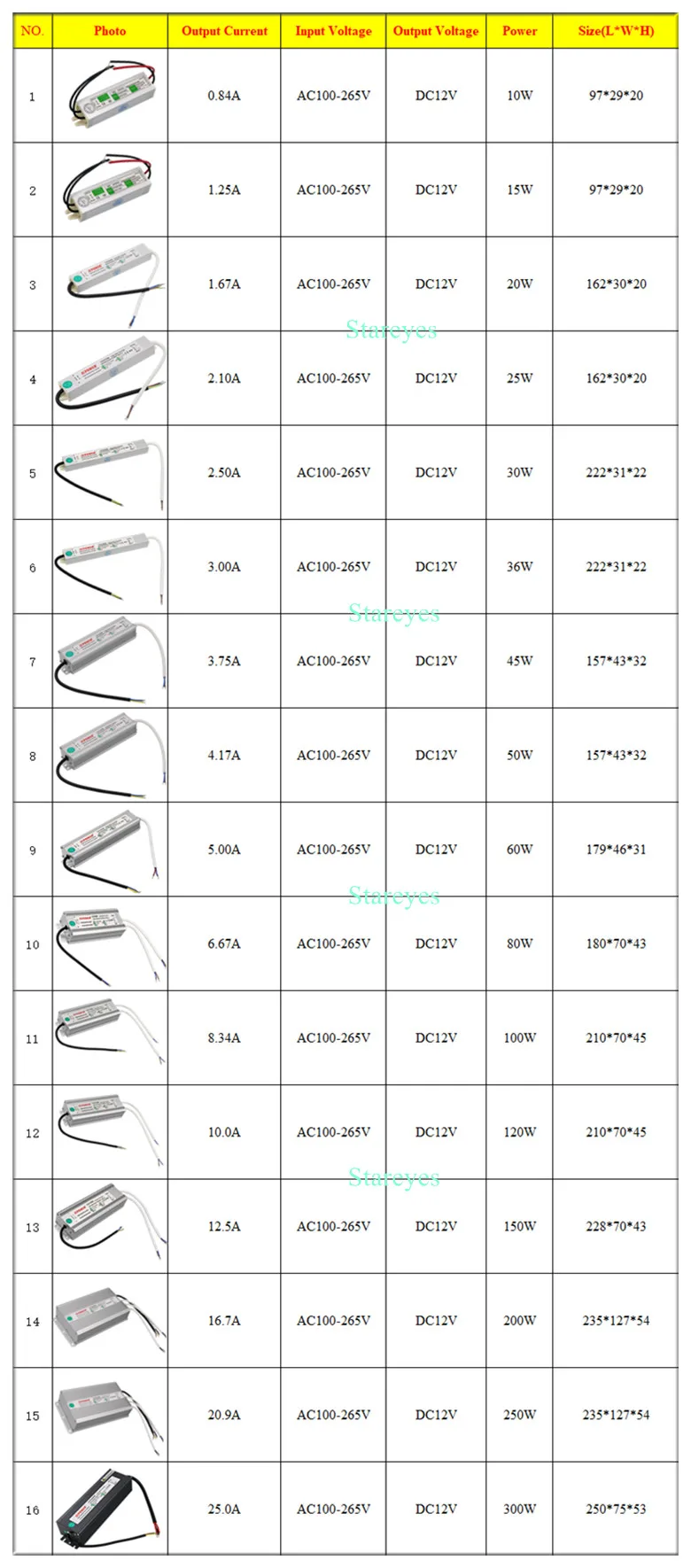 300W | AC100-265V | DC12V | USD$22.62/Pcs |