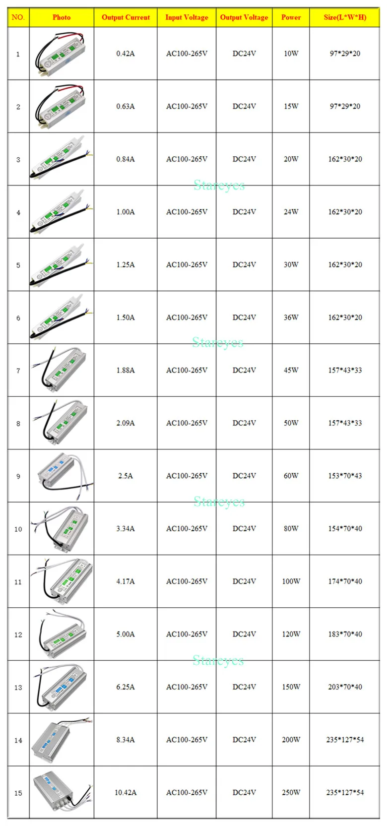 250W | AC100-265V | DC12V / DC24V | USD$13.05/Pcs | |