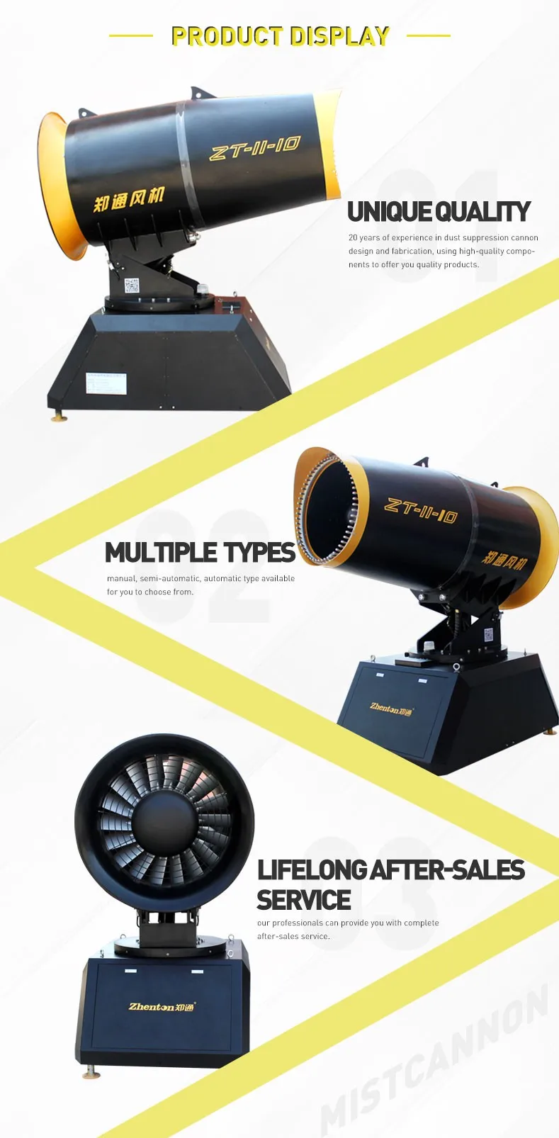 Zhenton fog cannons have a long reach and a long range and can suppress dust by producing a column of mist that leaves the 'cannon' at high speed and that can reach a range of 120 meters.When the mist or spray reaches the dust it can 'knock down' up to 90% of the dust. This type of dust suppression is best suited to building demolition, construction sites, quarries and mines, foundries, steel and slag facilities, waste transfer stations, and recycling plants.